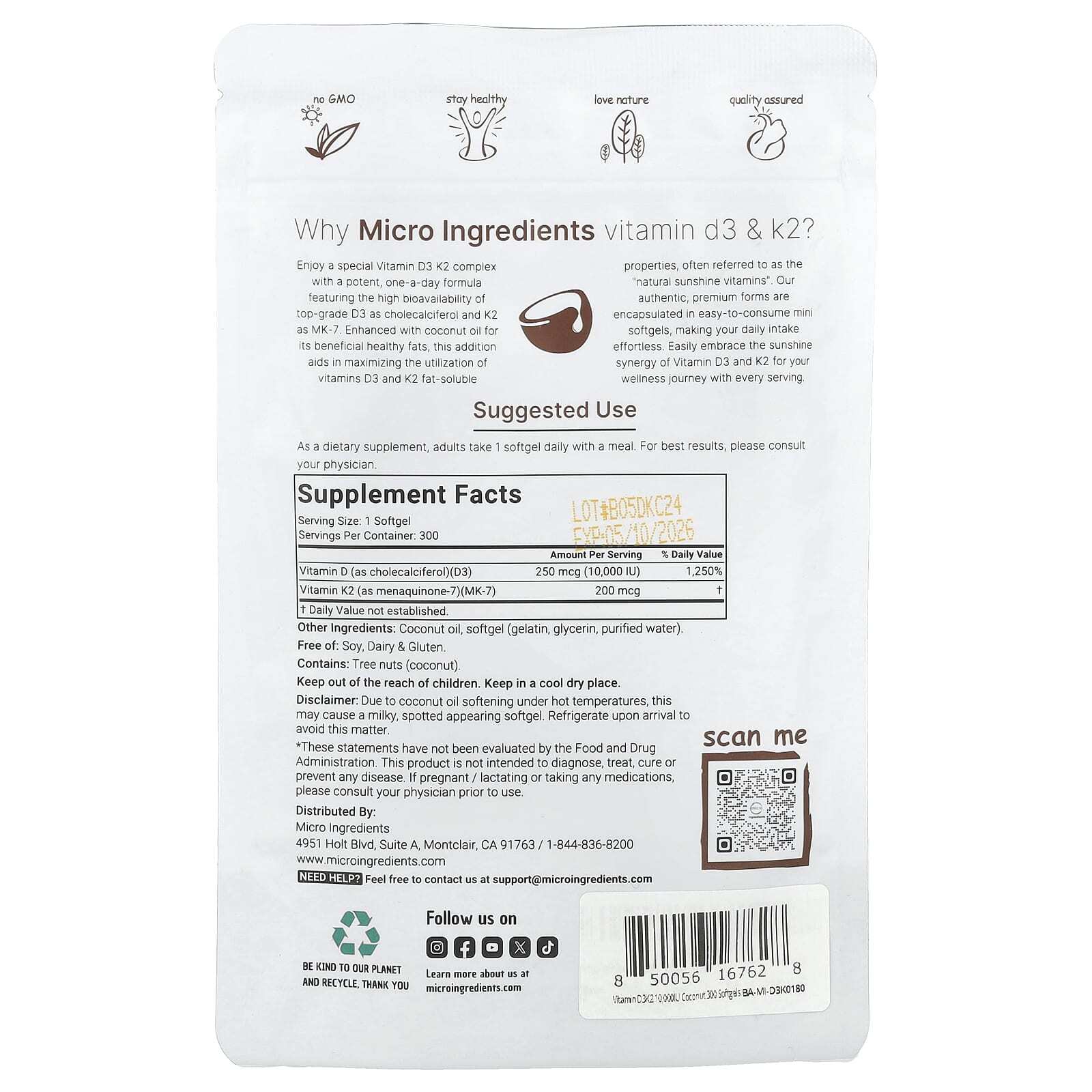 Наслаждайтесь специальным комплексом витаминов D3 и K2 с мощной формулой для приема один раз в день, отличающейся высокой биодоступностью высококачественного витамина D3 в виде холекальциферола и K2 в виде MK-7. Эта добавка, обогащенная кокосовым маслом, содержит полезные и полезные жиры, способствует максимальному использованию жирорастворимых витаминов D3 и K2, которые часто называют «натуральными солнечными витаминами». Наши подлинные формы премиального качества заключены в простые для употребления мини-капсулы, что облегчает ежедневное употребление. С каждой порцией витаминов D3 и K2 вы с легкостью добьетесь своего оздоровительного пути.