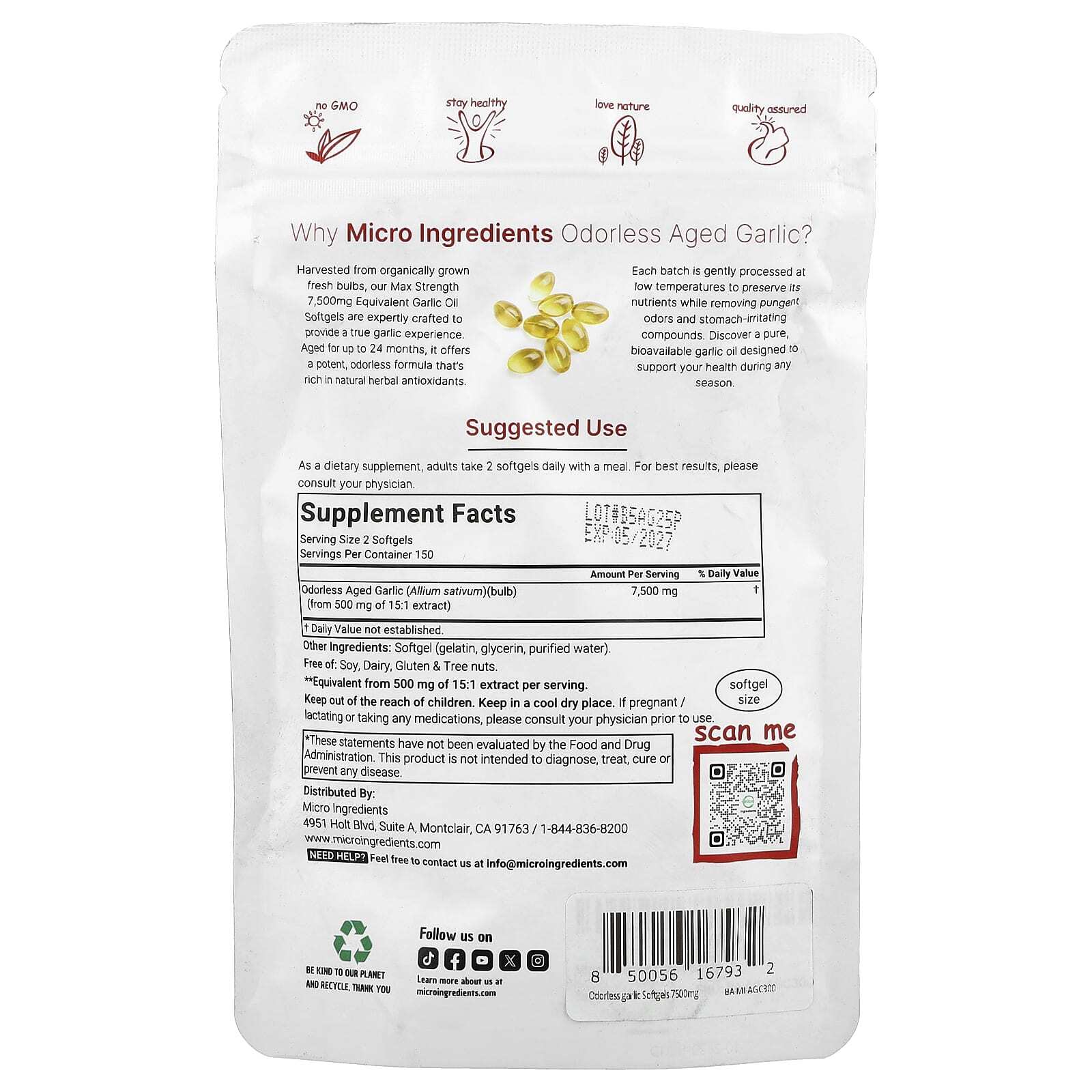 Наше максимальная сила действия, эквивалентная 7500 мг чесночного масла, получена из органически выращенных свежих луковиц. Она создана экспертами для того, чтобы обеспечить вкус настоящего чеснока. Выдержанный в течение 24 месяцев продукт предлагает эффективную формулу без запаха, богатую натуральными травяными антиоксидантами.