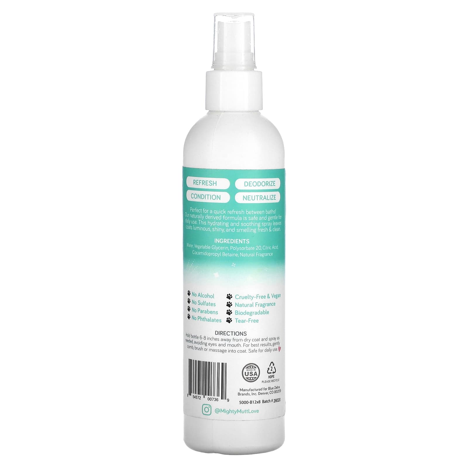 Держите флакон на высоте 15–25 см (6–8 дюймов) от сухой шерсти и распыляйте по мере необходимости, избегая попадания в глаза и рот. Для достижения наилучшего результата аккуратно нанесите расческой, расческой или массажными движениями нанесите средство на шерсть. Безопасно для ежедневного применения.