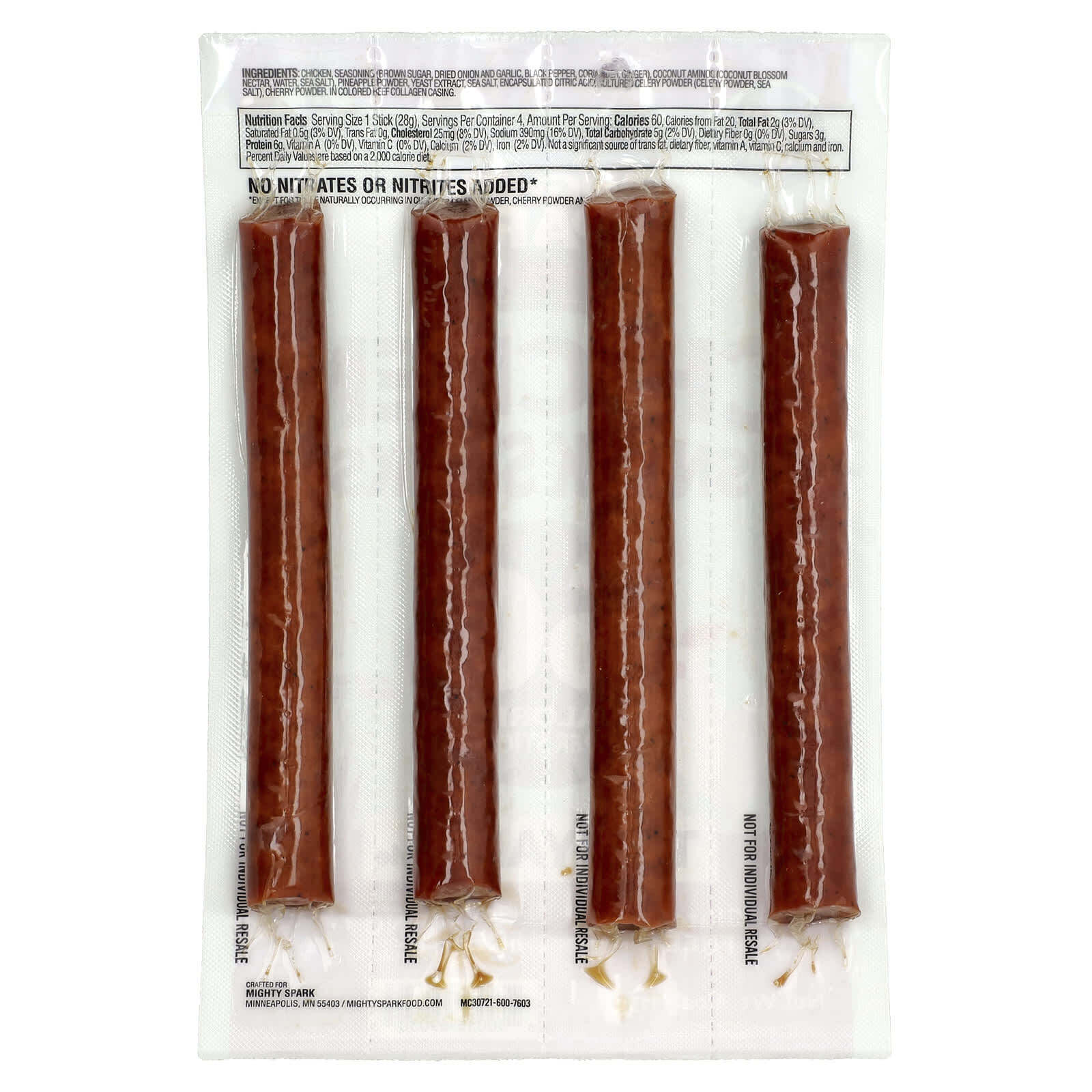 Курица, приправа (коричневый сахар, сушеный лук и чеснок, черный перец, кориандр, имбирь), кокосовые аминокислоты, (нектар из цветков кокоса, вода, морская соль), ананасовый порошок, экстракт дрожжей, морская соль, инкапсулированная лимонная кислота, порошок из культивированного сельдерея, морская соль), вишневый порошок. В оболочке из цветного говяжьего коллагена.