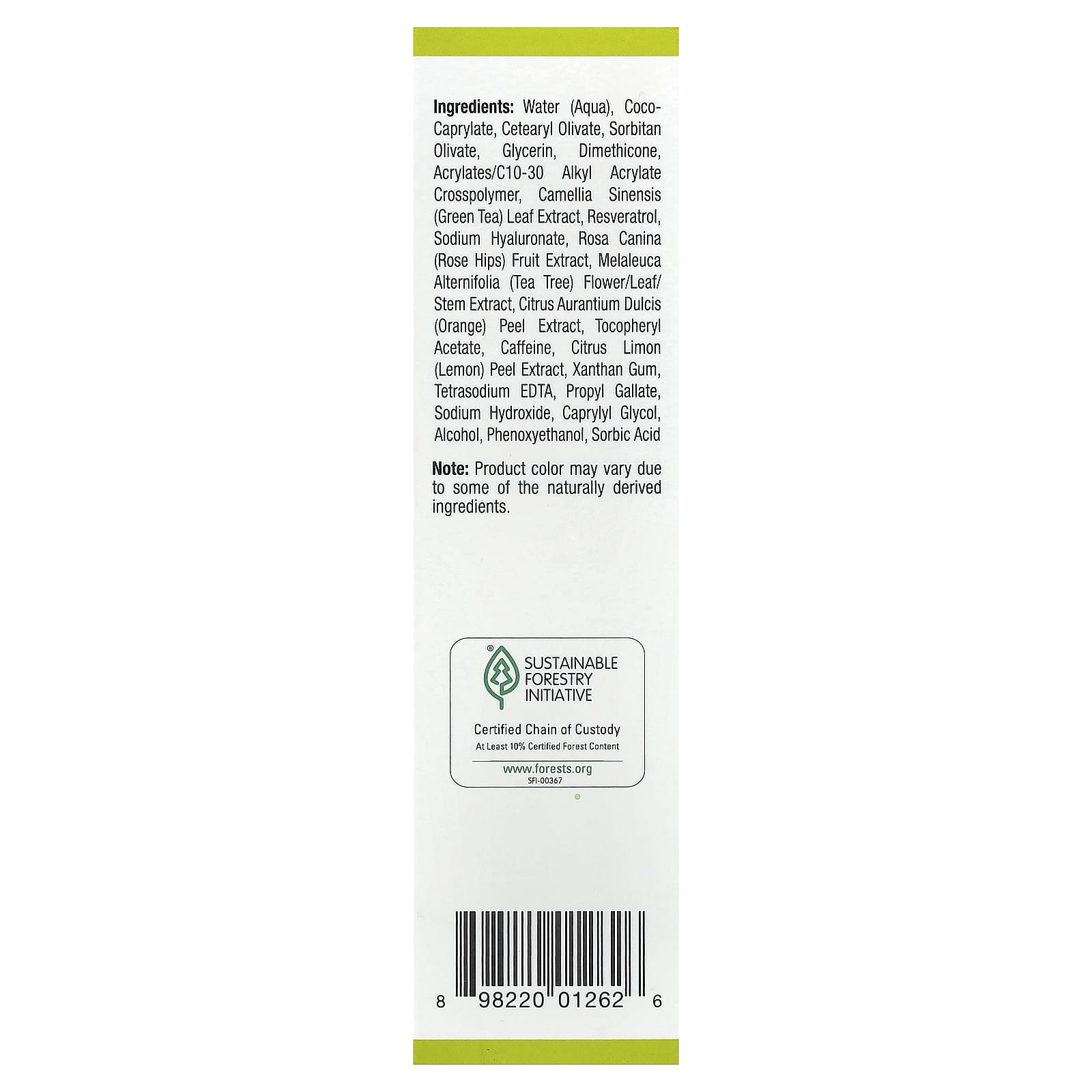Вода, кококаприлат, цетеарил оливат, сорбитан оливат, глицерин, Диметикон, акрилат/c10-30 алкил акрилат кроссполимер, экстракт листьев зеленого чая (Camellia sinensis), Ресвератрол, Гиалуронат натрия, экстракт плодов шиповника (Rosa canina), экстракт цветков/листьев/стеблей чайного дерева (Melaleuca alternifolia), экстракт апельсиновой цедры (Citrus aurantium dulcis), токоферилацетат, Кофеин, экстракт цедры лимона (Citrus limonum), ксантановая камедь, тетранатрия ЭДТК, пропилгаллат, гидроксид натрия, каприлилгликоль, спирта, феноксиэтанол, сорбиновая кислота.