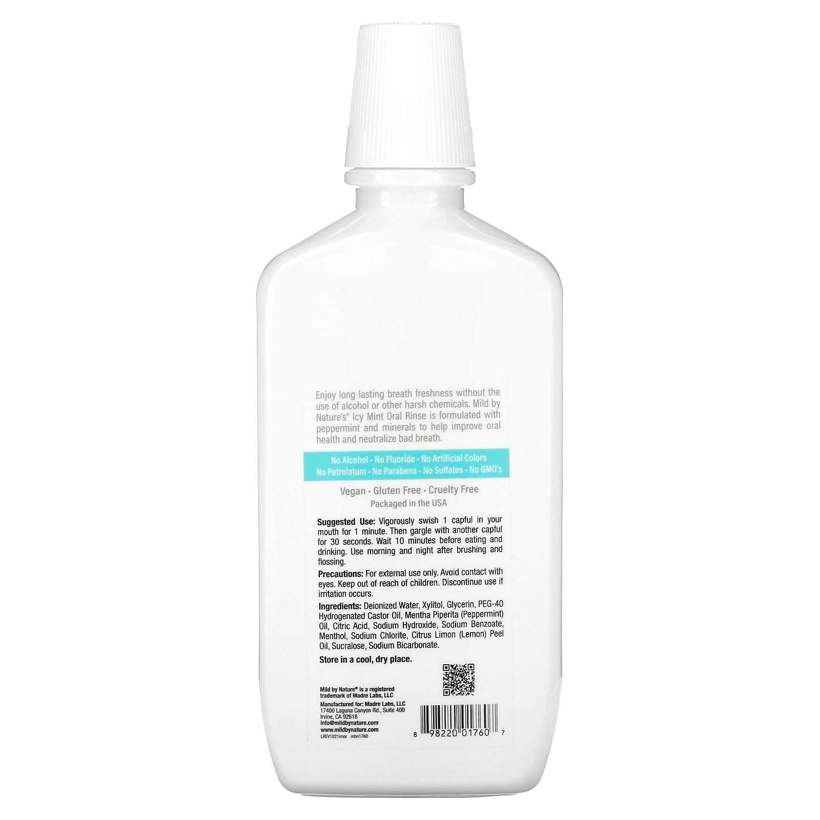 Освежающий ополаскиватель для полости рта с ароматом ледяной мяты от Mild By Nature содержит ксилитол, перечную мяту, ментол, минералы и касторовое масло для улучшения здоровья полости рта и нейтрализации неприятного запаха*.
