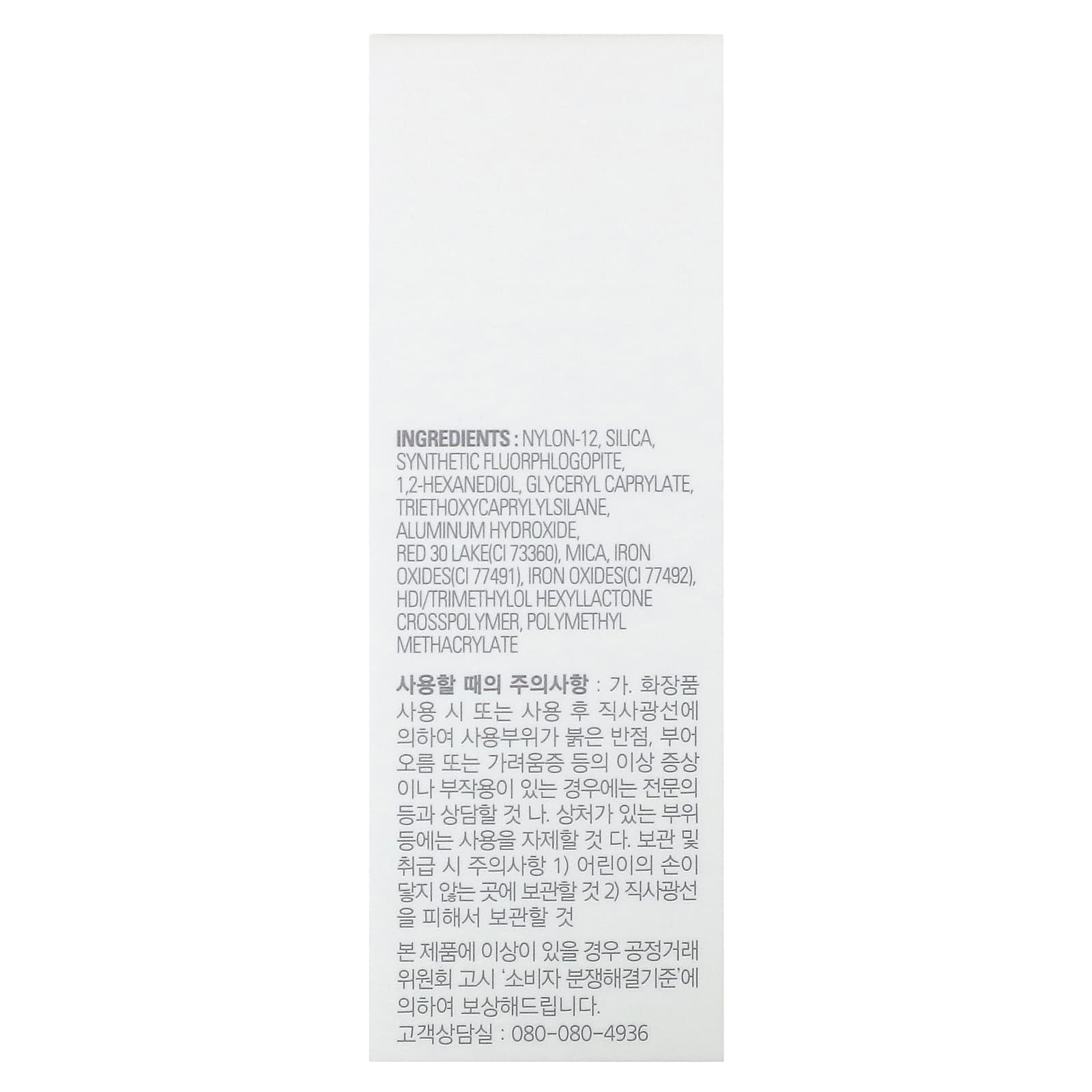 Нейлон-12, диоксид кремния, синтетический фторфлогопит, 1,2-гександиол, глицерил каприлат, триэтоксикаприлилсилан, гидроксид алюминия, краситель красный 30 лак (CI 73360), слюда, оксиды железа (CI 77491), оксиды железа (CI 77492), кроссполимер HDI / триметилол гексилактона, полиметилметакрилат.