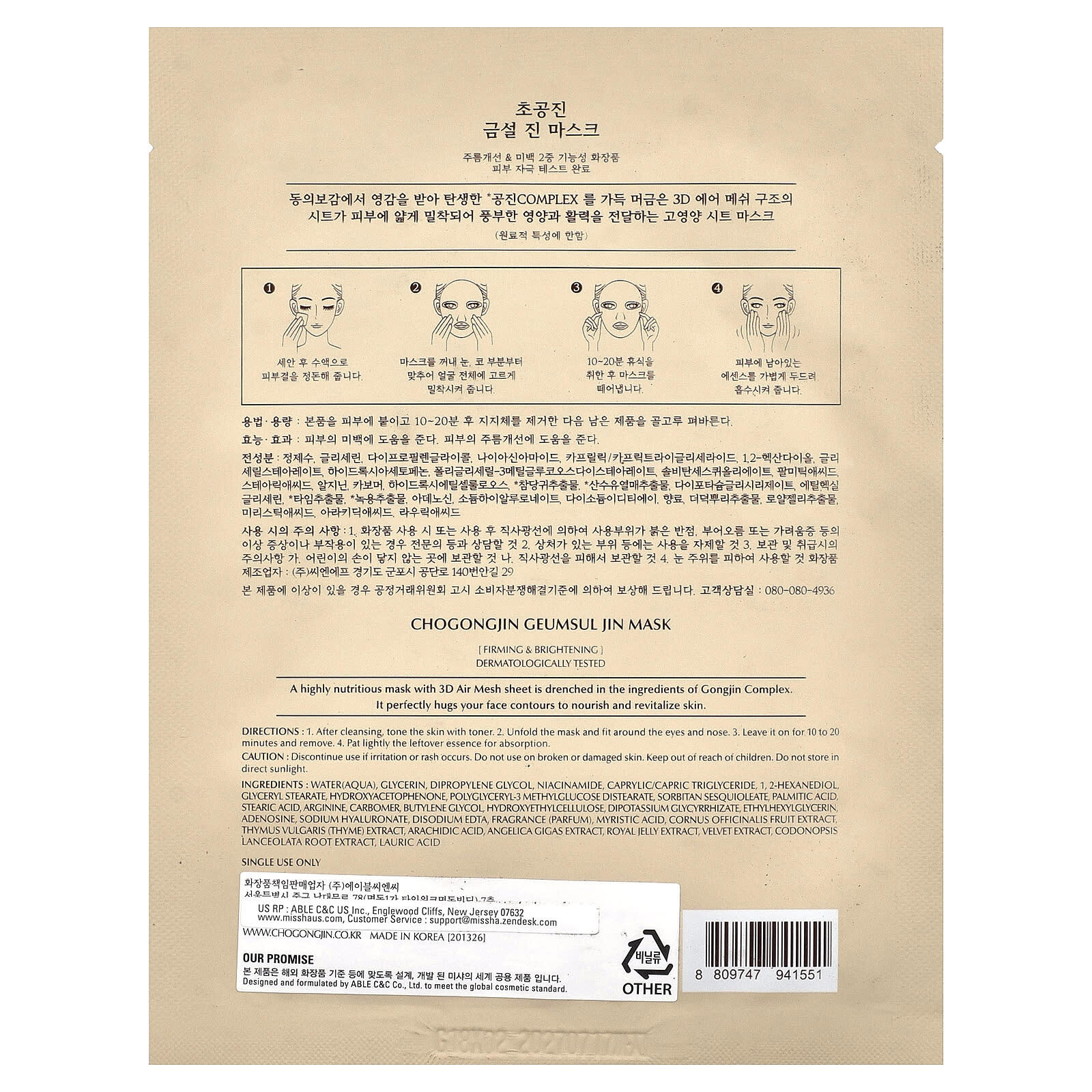 Очень питательная маска с тканевой тканью 3D Air Mesh пропитана ингредиентами Gongjin Complex. Он идеально подчеркивает контуры лица, питая и восстанавливая кожу.