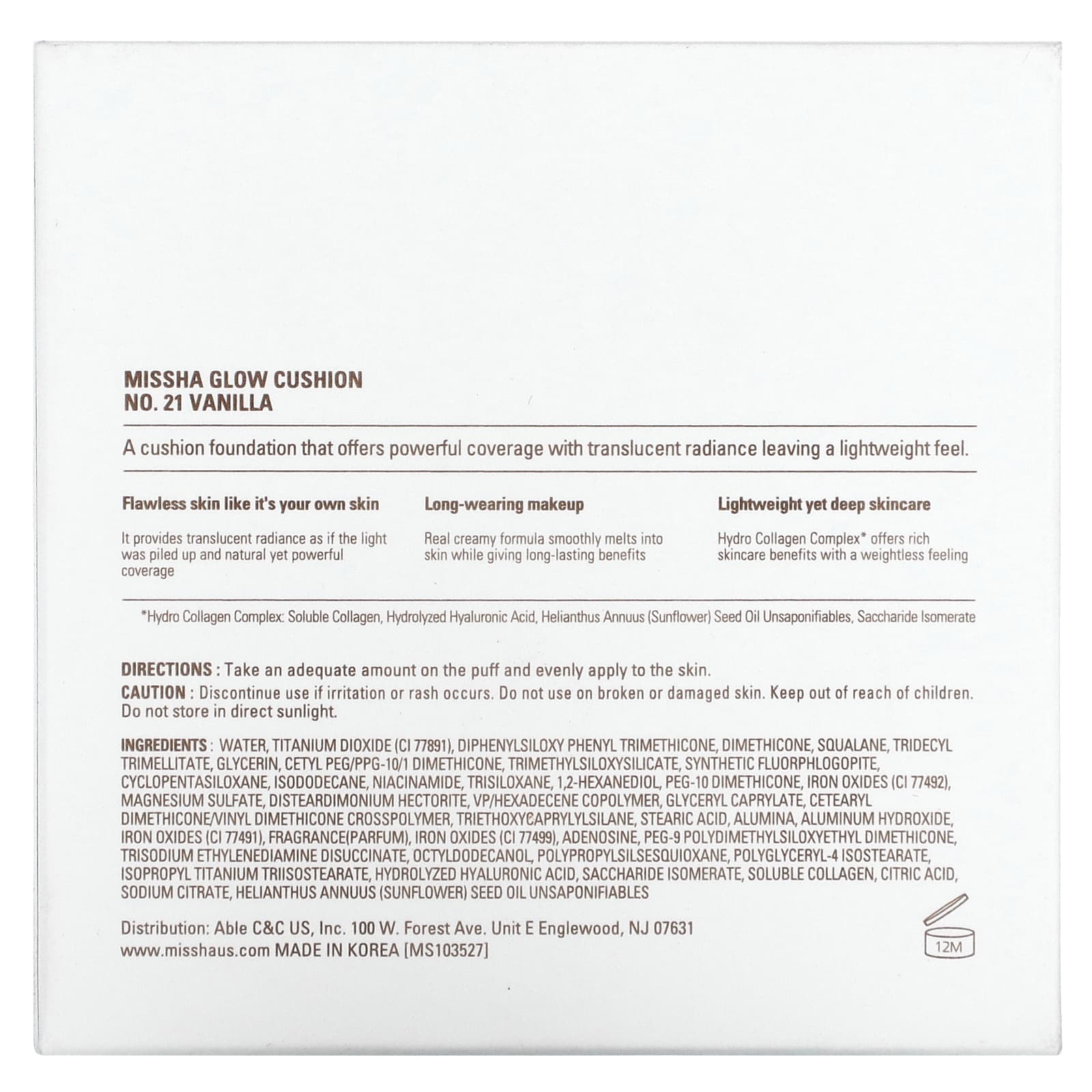 Вода, диоксид титана (CI 77891), дифенил силокси фенилтриметикон, диметикон, сквалан, тридецил тримеллитат, глицерин, цетил ПЭГ/ППГ-10/1 диметикон, триметилсилоксисиликат, синтетический фторфлогопит, циклопентасилоксан, изододекан, никотинамид, трисилоксан, 1,2-гександиол, ПЭГ-10 диметикон, оксиды железа (CI 77492), сульфат магния, дистеардимония гекторит, ВП/гексадецен сополимер, глицерил каприлат, цетеарил диметикон/винилдиметикон кроссполимер, триэтоксикаприлилсилан, стеариновая кислота, оксид алюминия, гидроксид алюминия, оксиды железа (CI 77491), отдушка (парфюмерная композиция), оксиды железа (CI 77499), аденозин, ПЭГ-9 полидиметилсилоксиэтил диметикон, тринатрий этилендиамин дисукцинат, октилдодеканол, полипропилсилсесквиоксан, полиглицерил-4 изостеарат, изопропилтриизостеарат титана, гидролизованная гиалуроновая кислота, инвертный сахар, растворимый коллаген, лимонная кислота, цитрат натрия, неомыляемое подсолнечное масло.