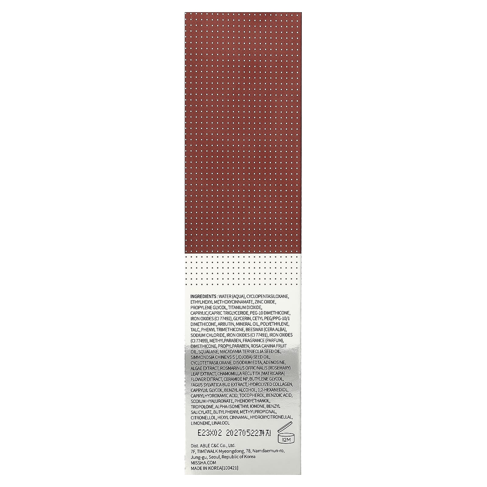 | Вспомогательные ингредиенты: вода, циклопентасилоксан, пропиленгликоль, каприловая/каприновая кислота. триглицерид, ПЭГ-10 диметикон, оксид железа желтый, глицерин, цетил ПЭГ/ППГ-10/1 диметикон, арбутин, минеральное масло, полиэтилен, тальк, фенилтриметикон, пчелиный воск (Cera alba), хлорид натрия, оксид железа красный, оксид железа метилпарабен, диметикон, пропилпарабен, масло плодов шиповника (Rosa canina), сквалан, масло семян макадамии (Macadamia terifolia), масло семян жожоба (Simmondsia chinensis), циклотетрасилоксан, двунатриевая ЭДТК, аденозин, экстракт водорослей, экстракт листьев розмарина (Rosmarinus officinalis), цветки ромашки лекарственной (Chamomilla recutita) экстракт, керамид NP, бутиленгликоль, экстракт бутонов боба садового, гидролизованный коллаген, каприлилгликоль, бензиловый спирт, 1,2-гександиол, каприлгидроксаминовая кислота, токоферол, бензойная кислота, гиалуронат натрия, феноксиэтанол, трополон, отдушка, бутилфенилметилпропион , бензилсалицилат, гидроксицитронеллаль, альфа-изометиллонон, гексил циннамал, линалоол, цитронеллол, лимонен. | |