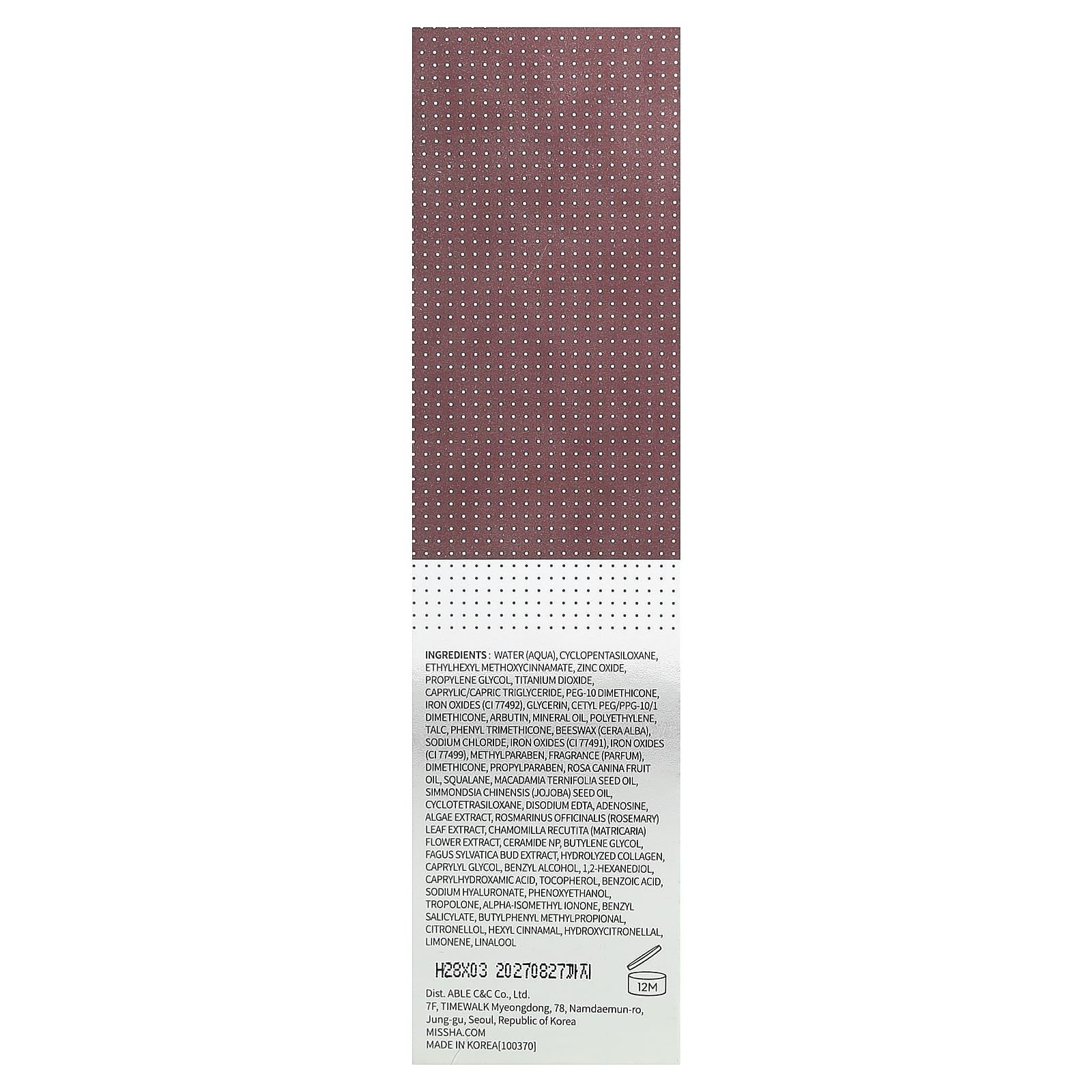 | Неактивные ингредиенты: Вода, циклопентасилоксан, пропиленгликоль, каприловая/каприновая, триглицерид, ПЭГ-10 диметикон, оксид железа, желтый глицерин, цетил ПЭГ/ППГ-10/1 диметикон, арбутин, минеральное масло, полиэтилен, тальк, фенилтриметикон, пчелиный воск (Cera alba ), хлорид натрия, оксид железа красный, оксид железа, метилпарабен, диметикон, пропилпарабен, масло шиповника (Rosa canina), сквалан, масло семян макадамии (Macadamia ternifolia), масло семян жожоба (Simmondsia chinensis), циклотетрасилоксан, двунатриевая ЭДТК, аденозин, экстракт водорослей, розмарин (Rosmarinus officinalis) экстракт листьев розмарина (Chamomilla recutita), экстракт цветков ромашки (Chamomilla recutita), керамид NP, бутиленгликоль, экстракт бутонов лесного гриба (Fgus sylbatica), гидролизованный коллаген, каприлилгликоль, бензиловый спирт, 1,2-гександиол, каприлгидроксаминовая кислота, токоферол, бензойная кислота, гиалуронат натрия , феноксиэтанол, трополон, отдушка, бутилфенил метилпропиональ, бензилсалицилат, гидроксицитронеллаль, альфа-изометилионон, гексил циннамал, линалоол, цитронеллол, лимонен. | |