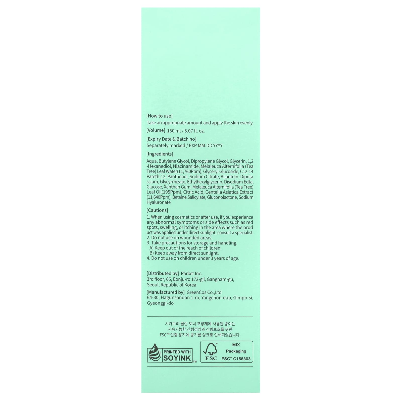 Вода, бутиленгликоль, дипропиленгликоль, глицерин, 1,2-гександиол, никотинамид, вода из листьев чайного дерева (Melaleuca alternifolia) (11 760 част./млн), глицерил глюкозид, с12-14 парет-12, пантенол, цитрат натрия, аллантоин, дикалий, глицирризат, этилгексилглицерин, двунатриевая ЭДТК, глюкоза, ксантановая камедь, масло из листьев чайного дерева (Melaleuca alternifolia) (195 част./млн), лимонная кислота, экстракт готу колы (Centella asiatica) (11 640 част./млн), бетаин салицилат, глюконолактон, гиалуронат натрия.