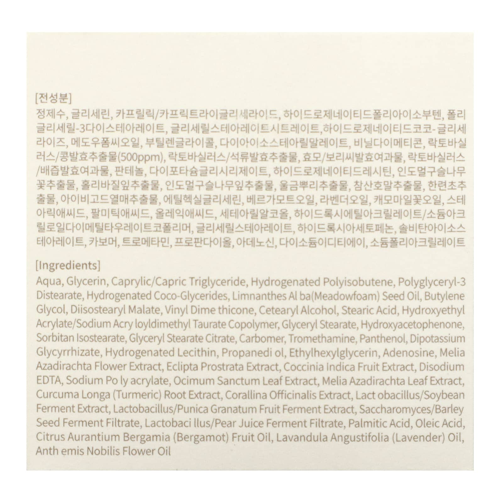 Вода (Aqua), глицерин, каприловый/каприновый триглицерид, гидрогенизированный полиизобутен, полиглицерил-3 дистеарат, гидрогенизированные кокоглицериды, масло из семян пенника лугового (Limnanthes al ba), бутиленгликоль, диизостеарил малат, винилдиметикон, цетеариловый спирт, стеариновая кислота, гидроксиэтил акрилат/натрия акрилоилдиметилтаурата сополимер, глицерил стеарат, гидроксиацетофенон, сорбитан изостеарат, глицерил стеарат цитрат, карбомер, трометамин, пантенол, дикалия глицирризат, гидрогенизированный лецитин, пропандиол, этилгексилглицерин, аденозин, экстракт цветков дерева ним (Melia azadirachta), экстракт эклипты простертой (Eclipta prostrata), экстракт плодов кокцинии индийской (Coccina indica), двунатриевая ЭДТК, полиакрилат натрия, экстракт листьев туласи (Ocimum sanctum), экстракт листьев дерева ним (Melia azadirachta), экстракт корня куркумы (Curcuma longa), экстракт кораллины целебной (Corallina officinalis), ферментированный экстракт лактобактерии и соевых бобов, лактобактерии (Lactobacillus) / ферментированный экстракт граната (Punica granatum), сахаромицеты / фильтрат закваски семян ячменя, фильтрат фермента сока лактобактерий / грушевого сока, пальмитиновая кислота, олеиновая кислота, масло бергамота (Citrus aurantium bergamia), лавандовое масло (Lavandula angustifolia), масло из цветков Anthemis nobilis.