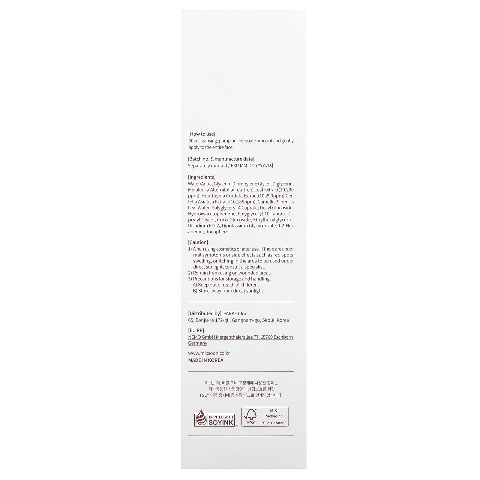 Вода, глицерин, дипропиленгликоль, диглицерин, экстракт листьев чайного дерева (Melaleuca alternifolia) (10290 част. / млн), экстракт houttuynia cordata (10290 част. / млн), экстракт центеллы азиатской (10185 част. / млн), вода из листьев зеленого чая (Camellia sinensis), полиглицерил-4 капрат, децил глюкозид, гидроксиацетофенон, полиглицерил-10 лаурат, каприлилгликоль, кокоглюкозид, этилгексилглицерин, двунатриевая ЭДТК, дикалия глицирризат, 1,2-гександиол, токоферол.