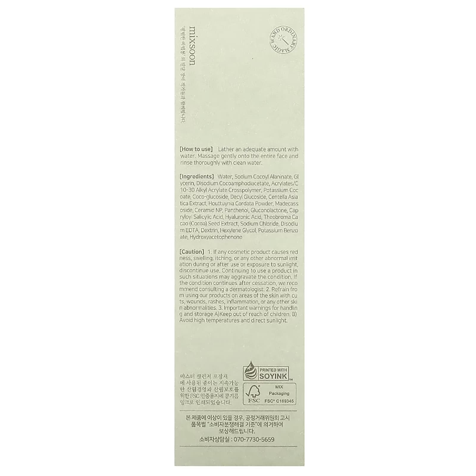 Вода, натрия кокоил аланинат, глицерин, кокоамфодиацетат динатрия, акрилаты / c 10-30 алкилакрилатный кроссполимер, кокоат калия, кокоглюкозид, децил глюкозид, экстракт готу колы (Centella asiatica), порошок из хауттюйнии (Houttuynia cordata), мадекассосид, керамид NP, пантенол, глюконолактон, каприлоил салициловой кислоты, гиалуроновая кислота, экстракт зерен какао (Theobroma cacao), хлорид натрия, двунатриевая ЭДТК, декстрин, гексиленгликоль, бензо калия, гидроксиацетофенон.