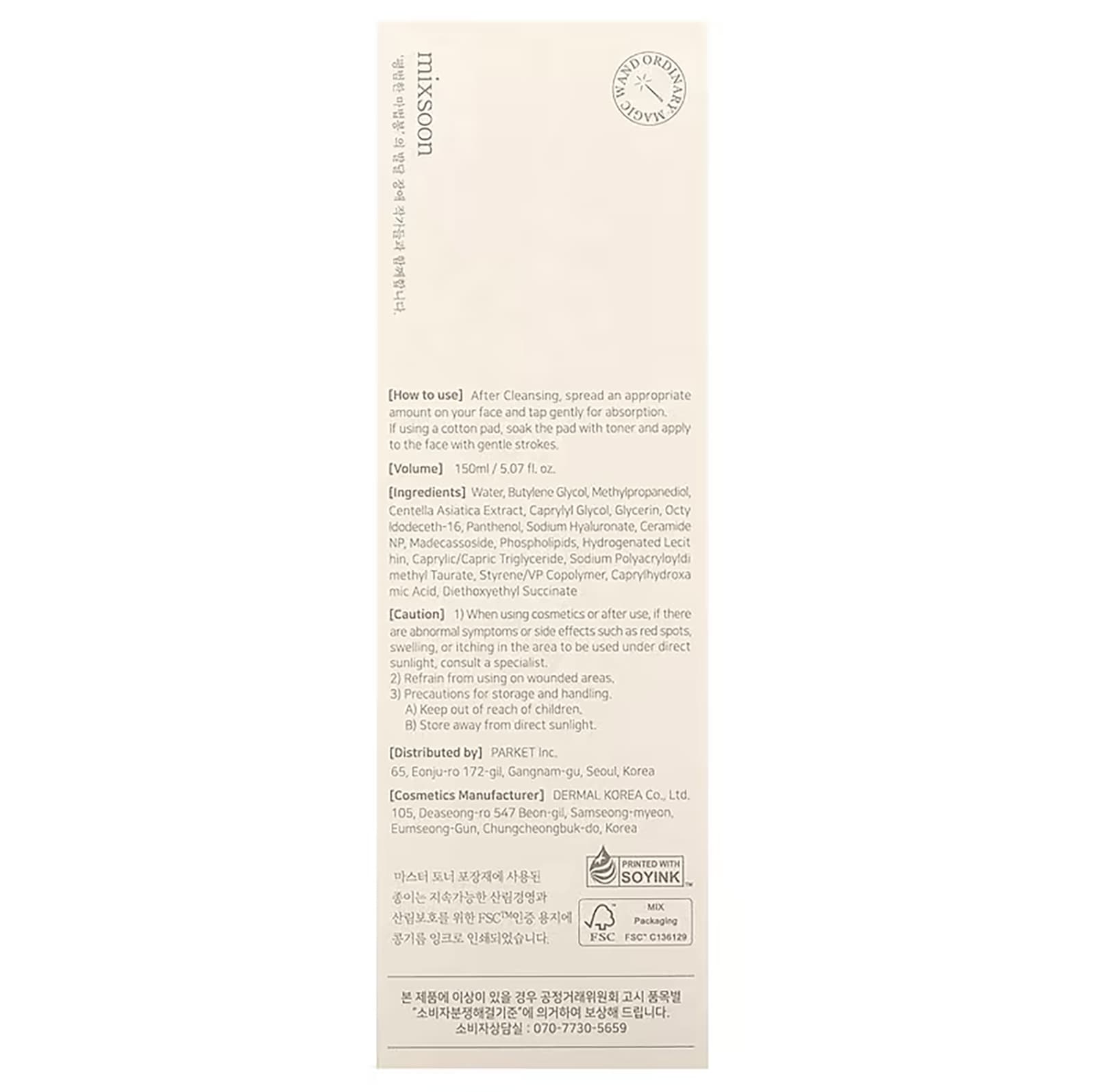 Вода, бутиленгликоль, метилпропандиол, экстракт готу колы (Centella asiatica), каприлилгликоль, глицерин, octyidodeceth-16, пантенол, гиалуронат натрия, керамид NP, мадекассосид, фосфолипидов, гидрогенизированный лецитин, каприловый/каприновый триглицерид, полиакрилодиметил таурат натрия, стирол / ВП сополимер, каприлгидроксаминовая кислота, диэтоксиэтил сукцинат.