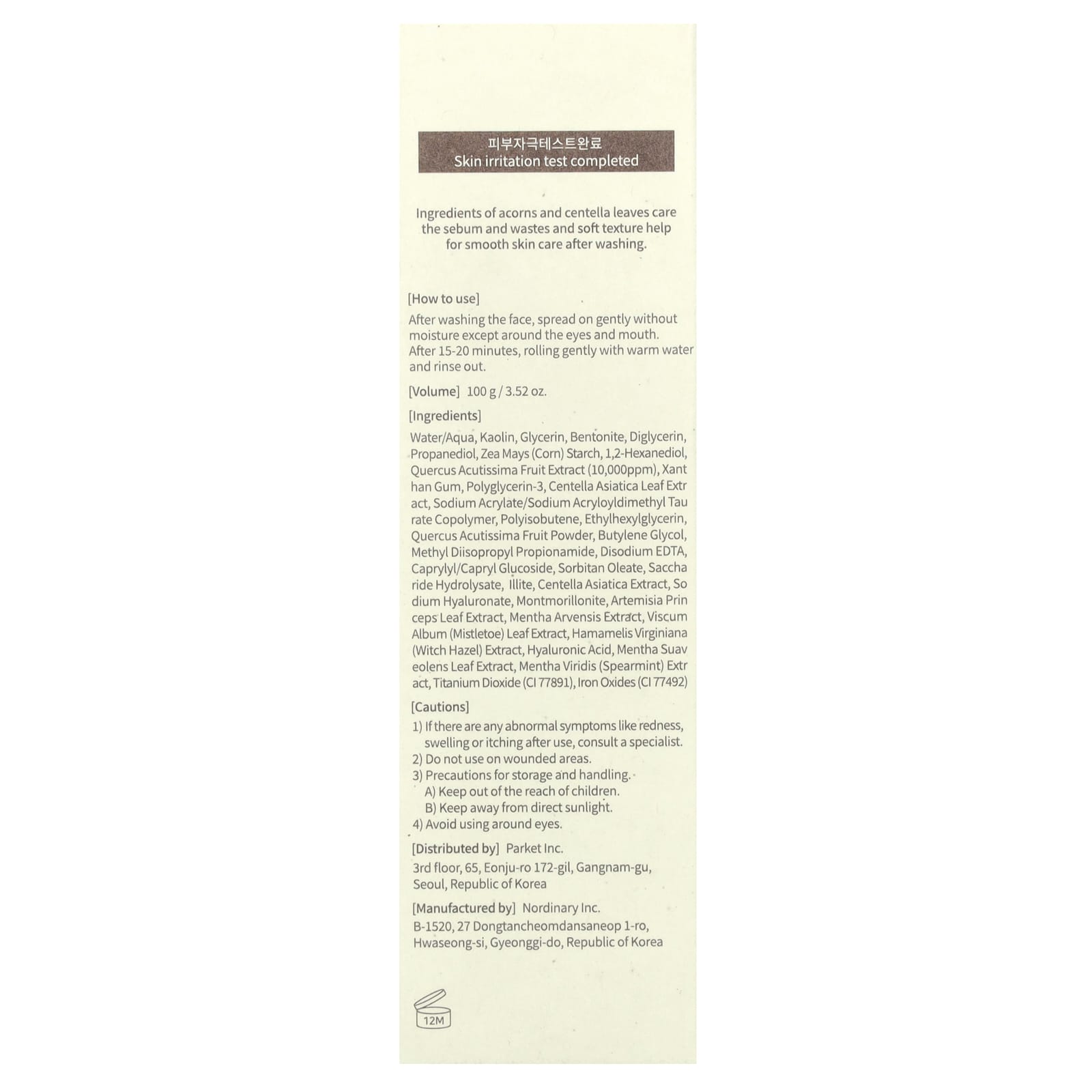 Вода (Aqua), каолин, глицерин, бентонит, диглицерин, пропандиол, кукурузный крахмал (Zea mays), 1,2-гександиол, экстракт плодов дуба (Quercus acutissima) (10 000 част./млн), ксантановая камедь, полиглицерин-3, экстракт листьев готу колы (Centella asiatica), натрий акрилат/натрий акрилоилдиметилтаурат сополимер, полиизобутен, этилгексилглицерин, порошок из плодов дуба (Quercus acutissima), бутиленгликоль, метил диизопропил пропионамид, двунатриевая ЭДТК, каприлил/каприл глюкозид, сорбитанолеат, сахарида гидролизат, иллит, экстракт готу колы (Centella asiatica), гиалуронат натрия, монтмориллонит, экстракт листьев полыни Прин (Artemisia prin ceps), экстракт полевой мяты (Mentha arvensis), экстракт листьев омелы (Viscum album), экстракт гамамелиса (Hamamelis virginiana), гиалуроновая кислота, экстракт листьев мяты круглолистной (Mentha suaveolens), экстракт мяты колосистой (Mentha viridis), диоксид титана (CI 77891), оксиды железа (CI 77492).