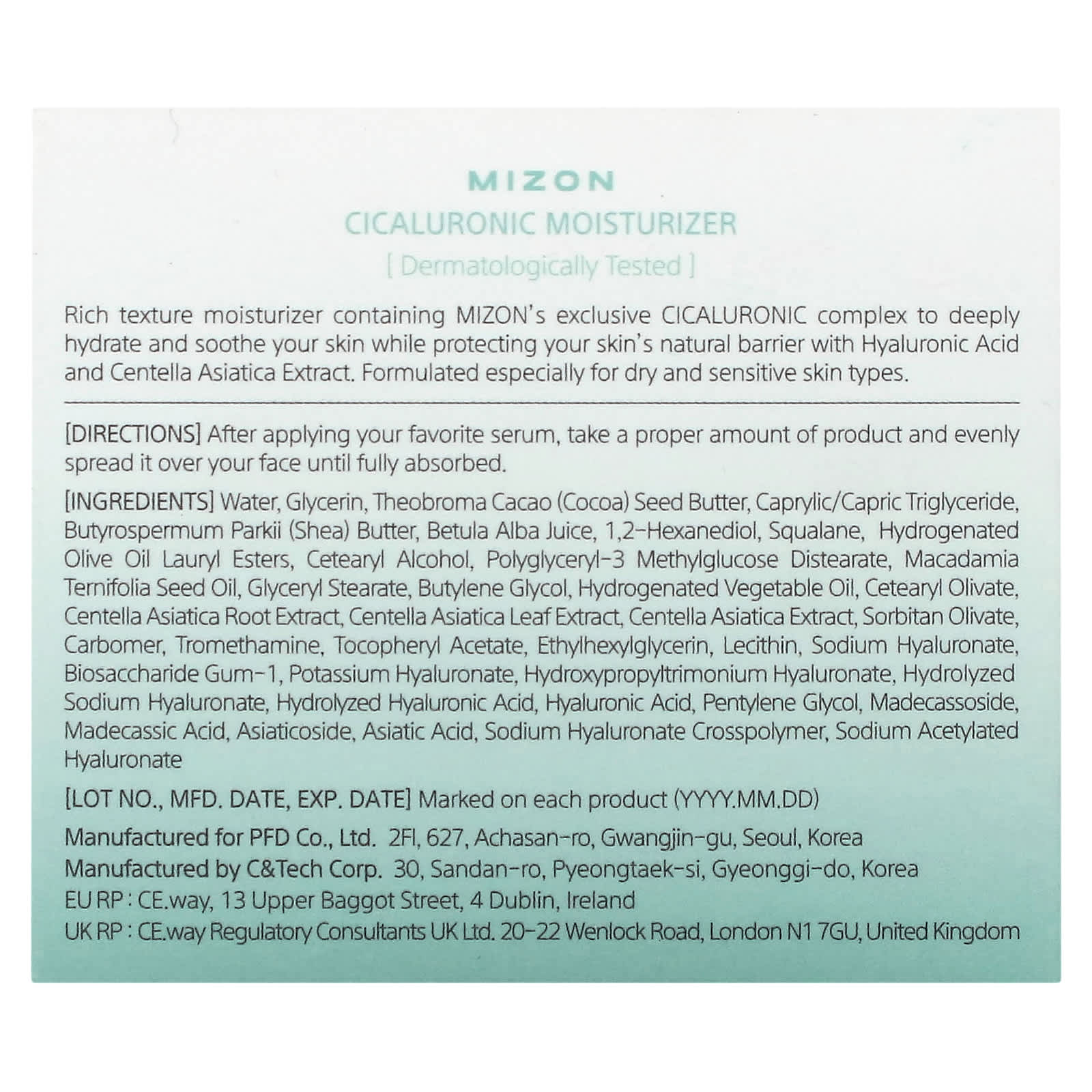 Увлажняющий крем с насыщенной текстурой содержит эксклюзивный комплекс Cicaluronic от Mizon, который глубоко увлажняет и успокаивает кожу, защищая естественный защитный барьер кожи с помощью гиалуроновой кислоты и экстракта готу колы (Centella asiatica). Разработано специально для сухой и чувствительной кожи.