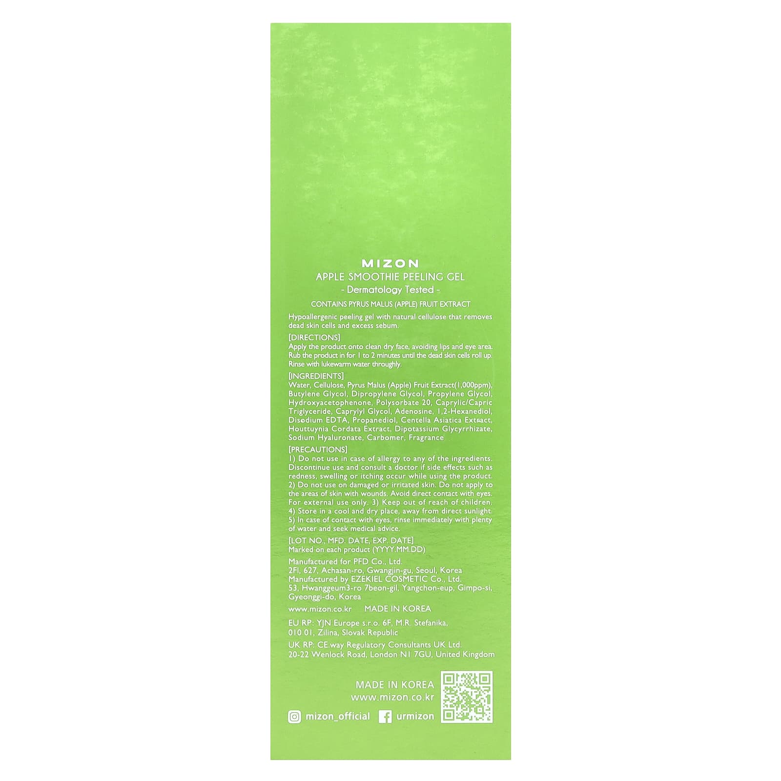 Вода, целлюлоза, экстракт плодов яблока (Pyrus malus) (1000 част. / млн), бутиленгликоль, дипропиленгликоль, пропиленгликоль, гидроксиацетофенон, полисорбат 20, каприловый/каприновый триглицерид, каприлилгликоль, аденозин, 1,2-гександиол, двунатриевая ЭДТК, пропандиол, экстракт готу колы (Centella asiatica), экстракт хауттюйнии (Houttuynia cordata), дикалия глицирризат, гиалуронат натрия, карбомер, отдушка.