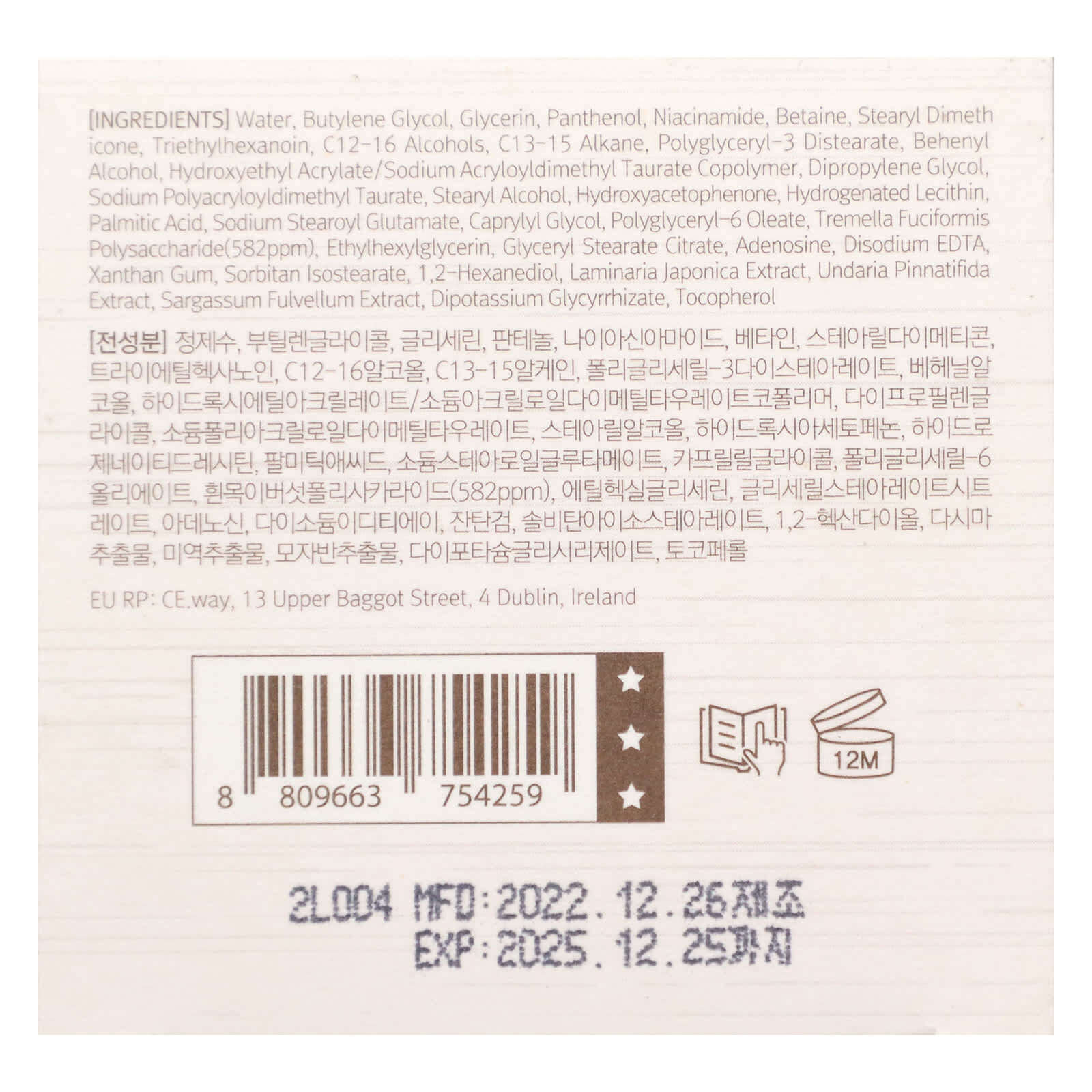 Вода, бутиленгликоль, глицерин, пантенол, никотинамид, бетаин, стеарил диметикон, триэтилгексаноин, спирты c12-16, C13–15 алкан, полиглицерил-3 дистеарат, бегениловый спирт, гидроксиэтил акрилат/натрия акрилоилдиметилтаурата сополимер, дипропиленгликоль, полиакрилодиметил таурат натрия, стеариловый спирт, гидроксиацетофенон, гидрогенизированный лецитин и пальмитиновая кислота, натрия стеароил глутамат, каприлилгликоль, полиглицерил-6-олеат, полисахарид tremella fuciformis (582 част. / млн), этилгексилглицерин, глицерил стеарат цитрат, аденозин, двунатриевая ЭДТК, ксантановая камедь, сорбитан изостеарат, 1,2-гександиол, экстракт ламинарии японской (Laminaria japonica), экстракт ундарии перистой (Undaria pinnatifida), экстракт саргассума (Sargassum fulvellum), дикалия глицирризат, токоферол.