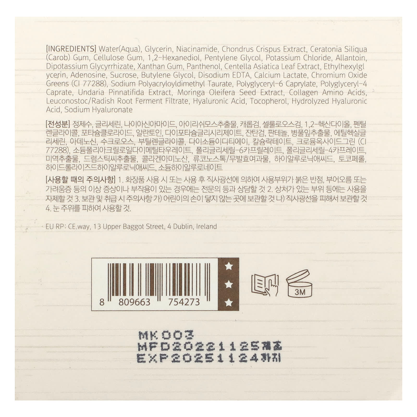 Вода (вода), глицерин, никотинамид, экстракт ирландского мха (Chondrus crispus), камедь рожкового дерева (Ceratonia siliqua), целлюлозная камедь, 1,2-гександиол, пентилен гликоль, хлорид калия, аллантоин, дикалия глицирризат, ксантановая камедь, пантенол, экстракт листьев готу колы (Centella asiatica), этилгексилглицерин, аденозин, сахароза, бутиленгликоль, двунатриевая ЭДТК, лактат кальция, хромовую зелень (CI 77288), полиакрилодиметил таурат натрия, полиглицерил-6 каприлат, полиглицерил-4 капрат, экстракт ундарии перистой (Undaria pinnatifida), экстракт семян моринги (Moringa oleifera), коллагеновые аминокислоты, лейконосток/ферментированный фильтрат корня редиса, гиалуроновая кислота, токоферол, гидролизованная гиалуроновая кислота, гиалуронат натрия.