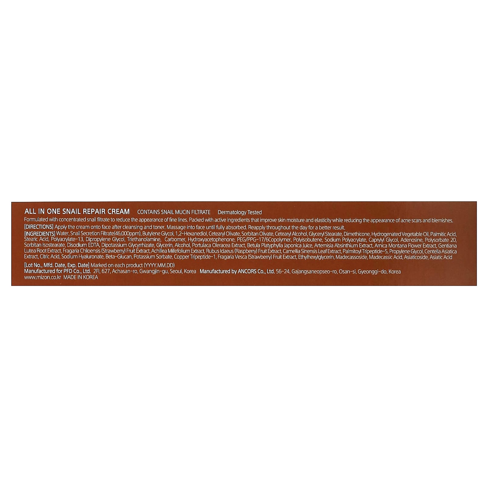 Вода, фильтрат секрета улитки (46 000 част./млн), бутиленгликоль, 1,2-гександиол, цетеарил оливат, сорбитан оливат, цетеариловый спирт, глицерил стеарат, диметикон, гидрогенизированное растительное масло, пальмитиновая кислота, стеариновая кислота, полиакрилат-13, дипропиленгликоль, триэтаноламин, карбомер, гидроксиацетофенон, ПЭГ/ППГ-17/6 сополимер, полиизобутен, полиакрилат натрия, каприлилгликоль, аденозин, полисорбат 20, сорбитан изостеарат, двунатриевая ЭДТК, дикалия глицирризат, глицерин, спирт, экстракт портулака огородного (Portulaca oleracea), сок березы плосколистной (Betula platyphylla japonica), экстракт полыни горькой (Artemisia absinthium), экстракт цветков арники (Arnica montana), экстракт корня горечавки (Gentiana lutea), экстракт ягод клубники (Fragaria chiloensis), экстракт тысячелистника обыкновенного (Achillea millefolium), экстракт ягод малины (Rubus idaeus), экстракт листьев зеленого чая (Camellia sinensis), пальмитоил трипептид-5, пропиленгликоль, экстракт готу колы (Centella asiatica), лимонная кислота, гиалуронат натрия, бета-глюкан, сорбат калия, трипептид меди-1, экстракт ягод клубники (Fragaria vesca), этилгексилглицерин, мадекассозид, мадекассовая кислота, азиатская кислота.