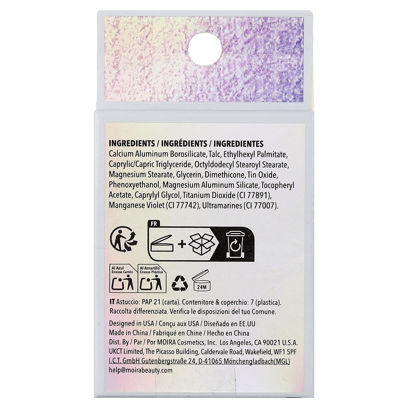 кальция алюминий боросиликат, тальк, этилгексил пальмитат, каприловый/каприновый триглицерид, октилдодецил стеароил стеарат, стеарат магния, глицерин, диметикон, оксид олова, феноксиэтанол, алюмосиликат магния, токоферилацетат, каприлилгликоль, диоксид титана (CI 77891), краситель темно-фиолетовый (CI 77742), ультрамарин (CI 77007).