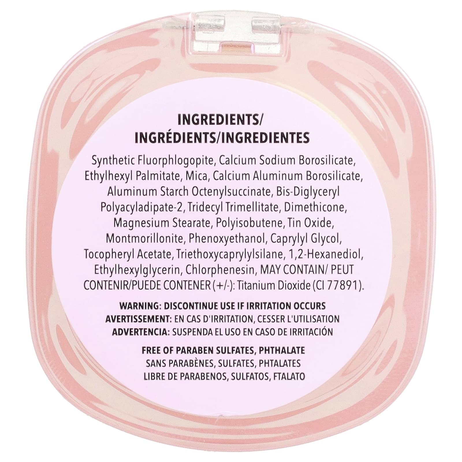 Синтетический фторфлогопит, кальций натрий боросиликат, этилгексил пальмитат, слюда, кальций алюминий боросиликат, алюминия крахмал октенилсукцинат, бис-диглицерил полиациладипат-2, тридецил тримеллитат, диметикон, стеарат магния, полиизобутен, оксид олова, монтмориллонит, феноксиэтанол, каприлилгликоль, токоферилацетат, триэтоксикаприлилсилан, 1,2-гександиол, этилгексилглицерин, хлорфенезин, может содержать (+/-) диоксид титана (CI 77891).