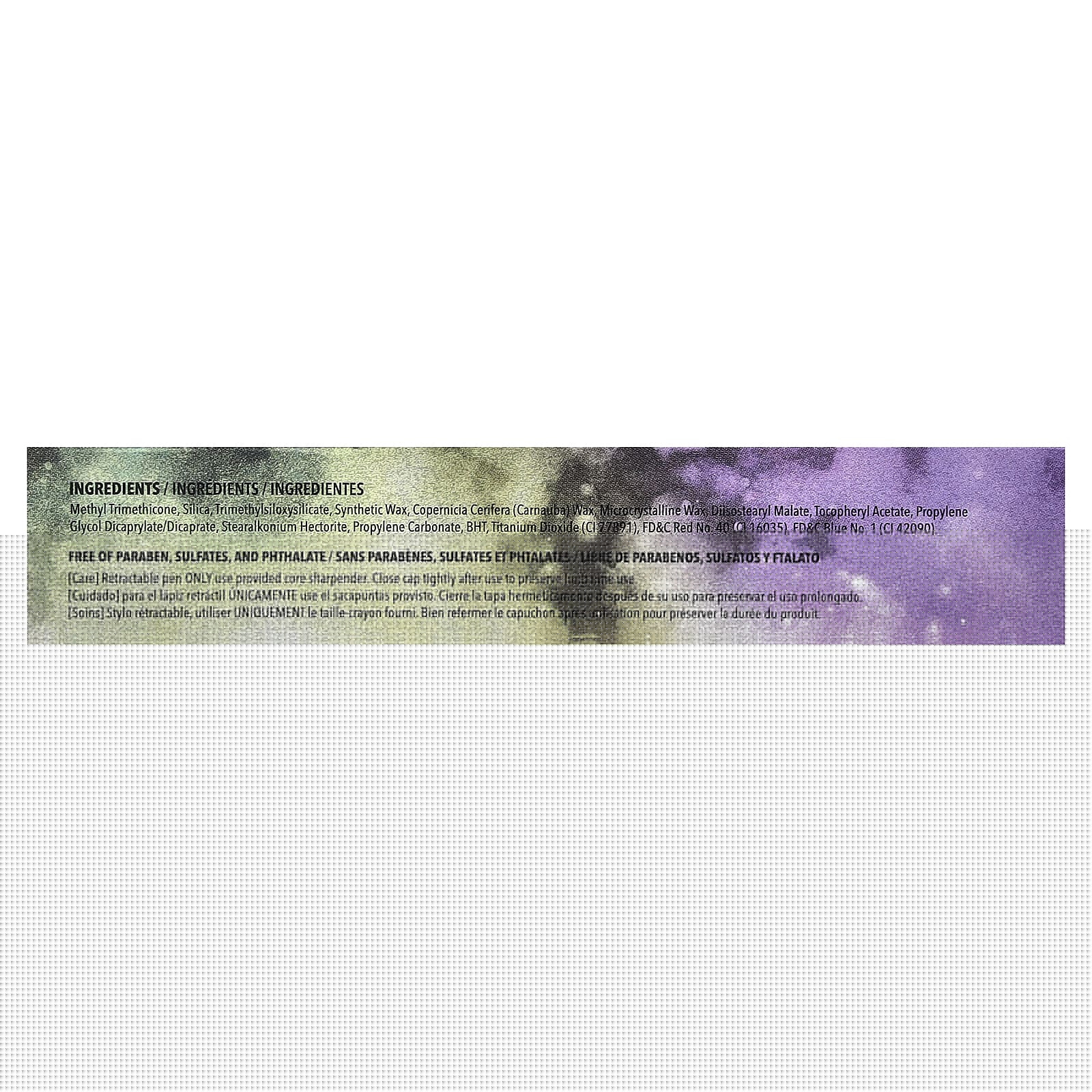 Метилтриметикон, диоксид кремния, триметилсилоксисиликат, синтетический воск, карнаубский воск (Copernicia cerifera), микрокристаллический воск, диизостеарил малат, токоферилацетат, пропиленгликоль дикаприлат/дикапрат, стеаралкония гекторит, пропиленкарбонат, бутилгидрокситолуол, диоксид титана (CI 77891), краситель красный FD&C 40 (CI 16035), краситель синий FD&C 1 (CI 42090).