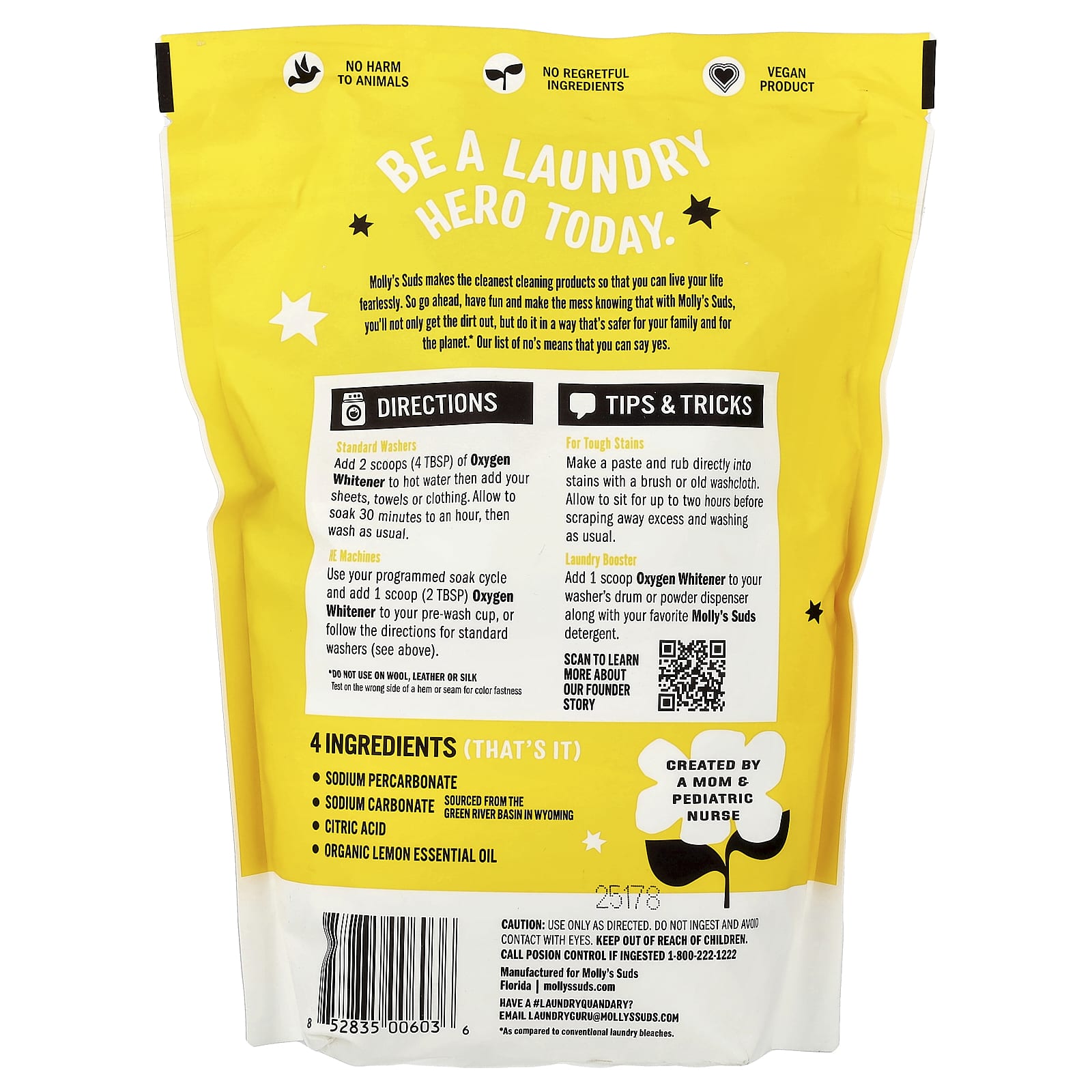 Добавьте 1 мерную ложку кислородного отбеливателя в барабан стиральной машины или дозатор порошка вместе с вашим любимым моющим средством Molly's Suds.