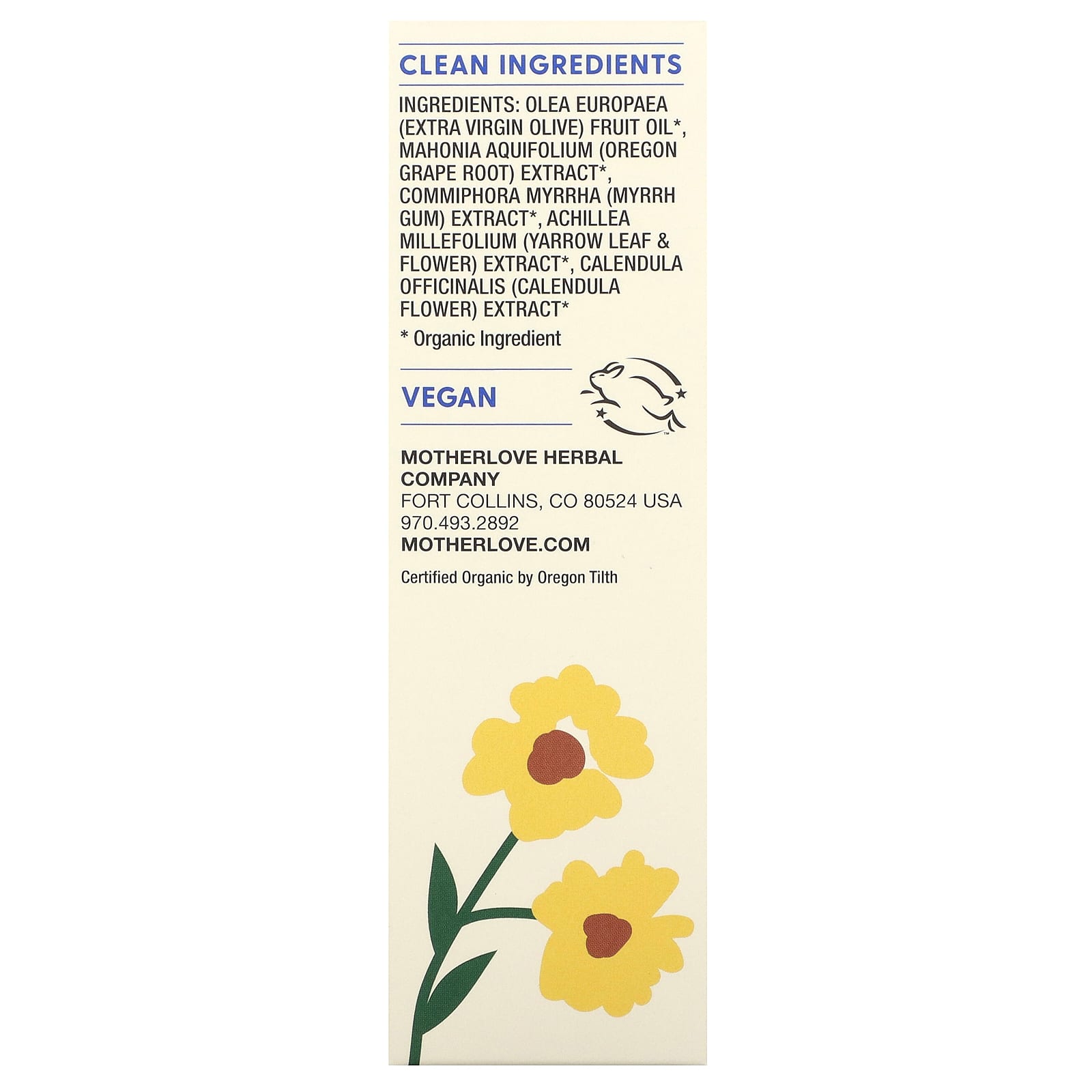 Масло из плодов оливы высшего качества (Olea europaea), экстракт корня орегонского винограда (Mahonia aquifolium) *, экстракт камеди мирры (Commiphora myrrha) *, экстракт листьев и цветков тысячелистника тысячелистника (Achillea millefolium) *, экстракт цветков календулы (Calendula officinalis) *.