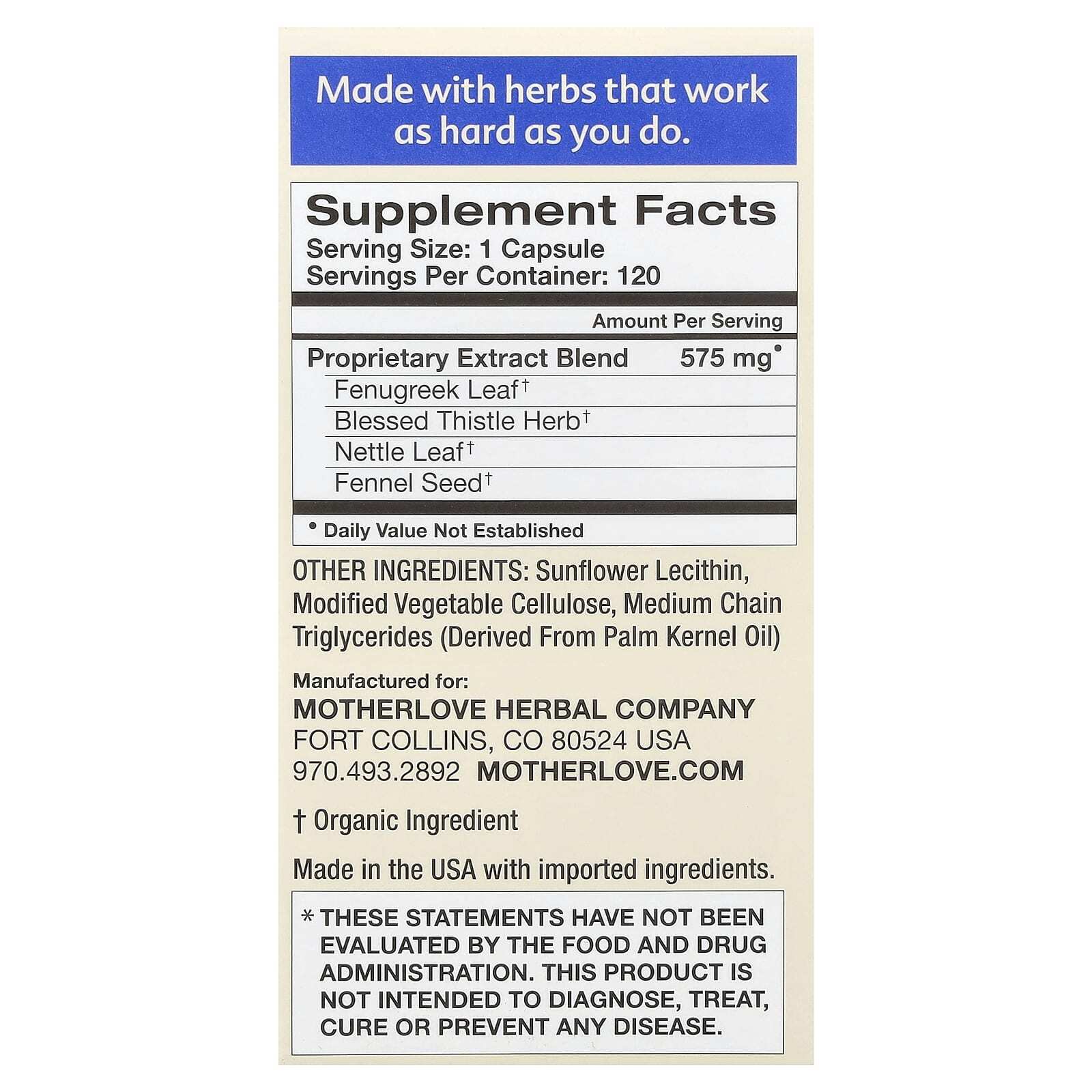 Запатентованная смесь экстрактов Семена пажитника† Кникус благословенный (трава)† Листья крапивы† Семена фенхеля† | 575 мг | * |
