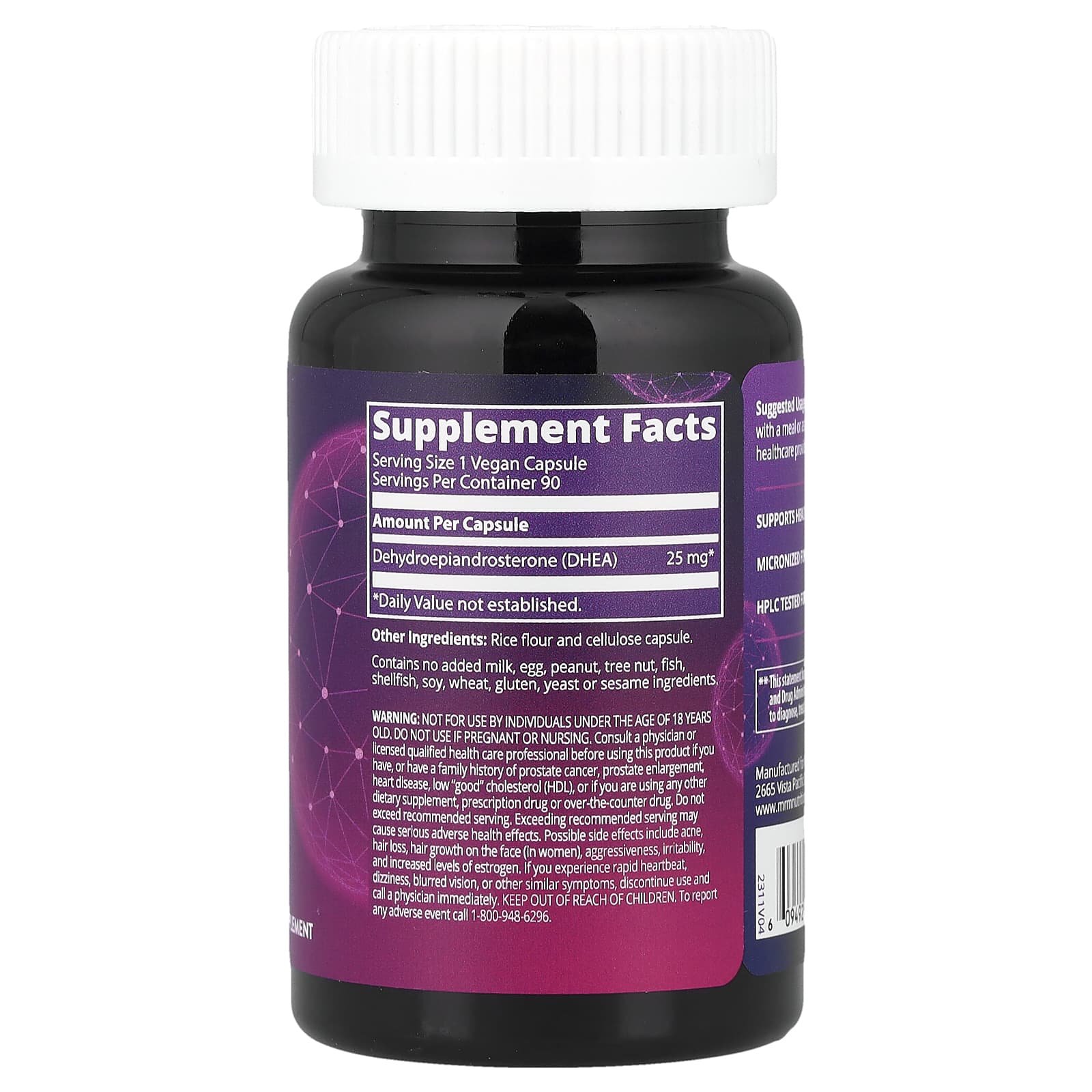Не предназначен для применения лицами до 18 лет. Не следует принимать в период беременности или кормления грудью. Проконсультируйтесь с квалифицированным медицинским работником перед использованием этого продукта, если у вас или у кого-либо из вашей семьи были или есть такие заболевания, как рак груди, рак простаты, увеличение простаты, болезни сердца, низкий уровень хорошего холестерина (HDL), или если вы принимаете какие-либо пищевые добавки, рецептурные или медицинские препараты. Не следует превышать рекомендуемую дозировку. Превышение рекомендуемой дозы может вызвать серьезные негативные последствия для здоровья. Возможные побочные эффекты включают акне, выпадение волос, рост волос на лице (у женщин), агрессивность, раздражительность и повышение уровня эстрогена. Прекратите применение и немедленно обратитесь к врачу, если у вас наблюдаются учащенное сердцебиение, головокружение, помутнение зрения или другие подобные симптомы. Хранить в недоступном для детей месте.