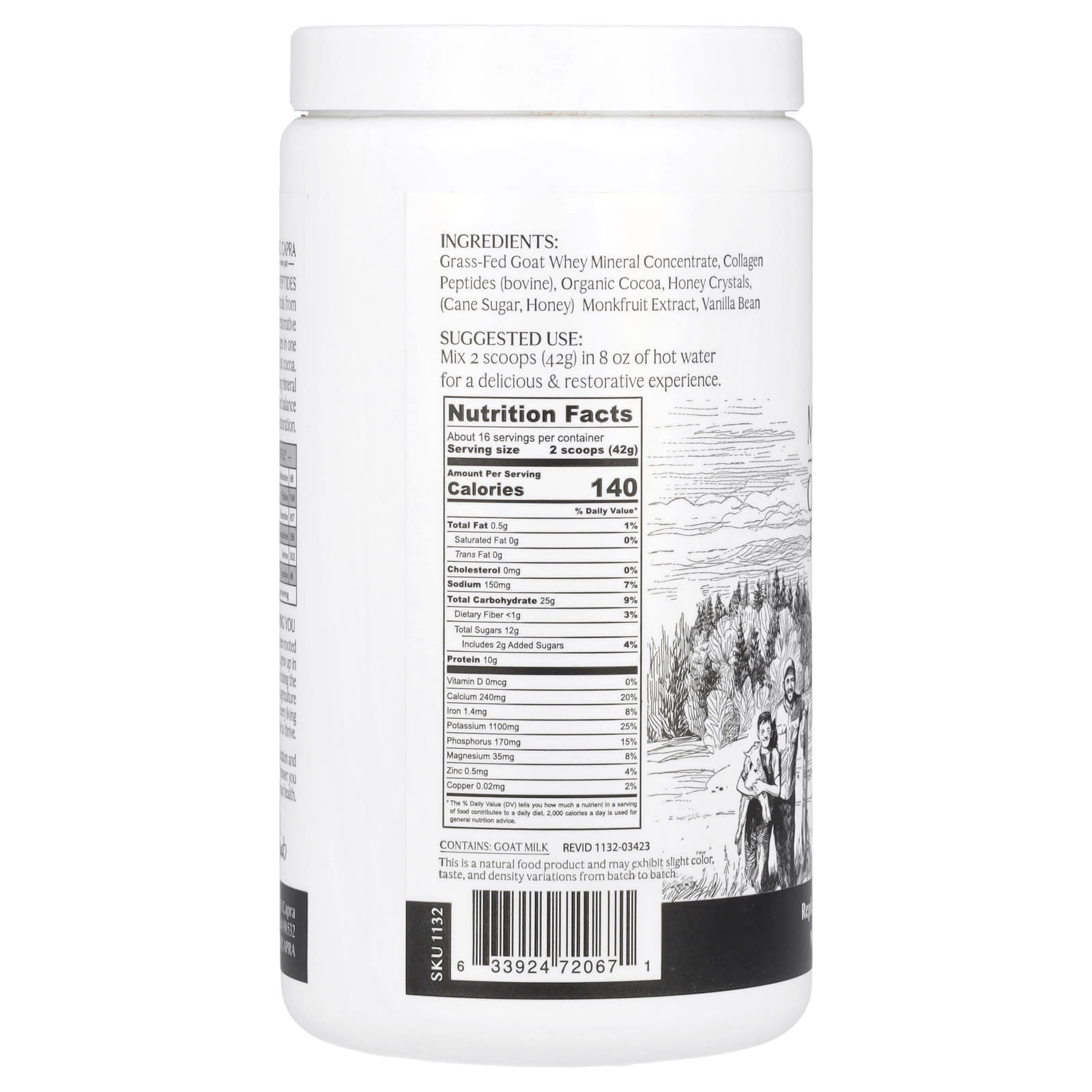 Минеральный концентрат сыворотки из козьей коры, пептиды коллагена (бычий), органическое какао, кристаллы меда, (тростниковый сахар, мед), экстракт монофрута, стручки ванили.