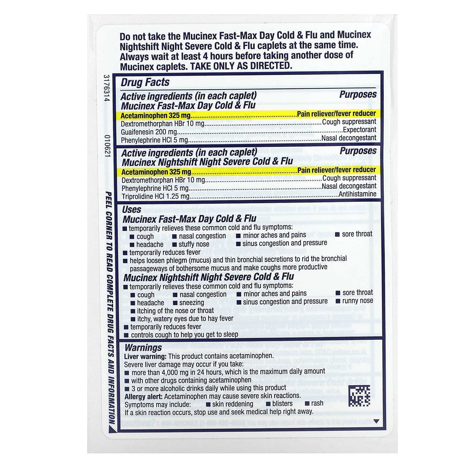 Не принимайте капсулы от простуды и гриппа Mucinex Fast-Max Day и Mucinex Nightshift от простуды и гриппа одновременно. Всегда следует подождать не менее 4 часов, прежде чем принять еще одну дозу капсул Mucinex. Применять только согласно инструкции.