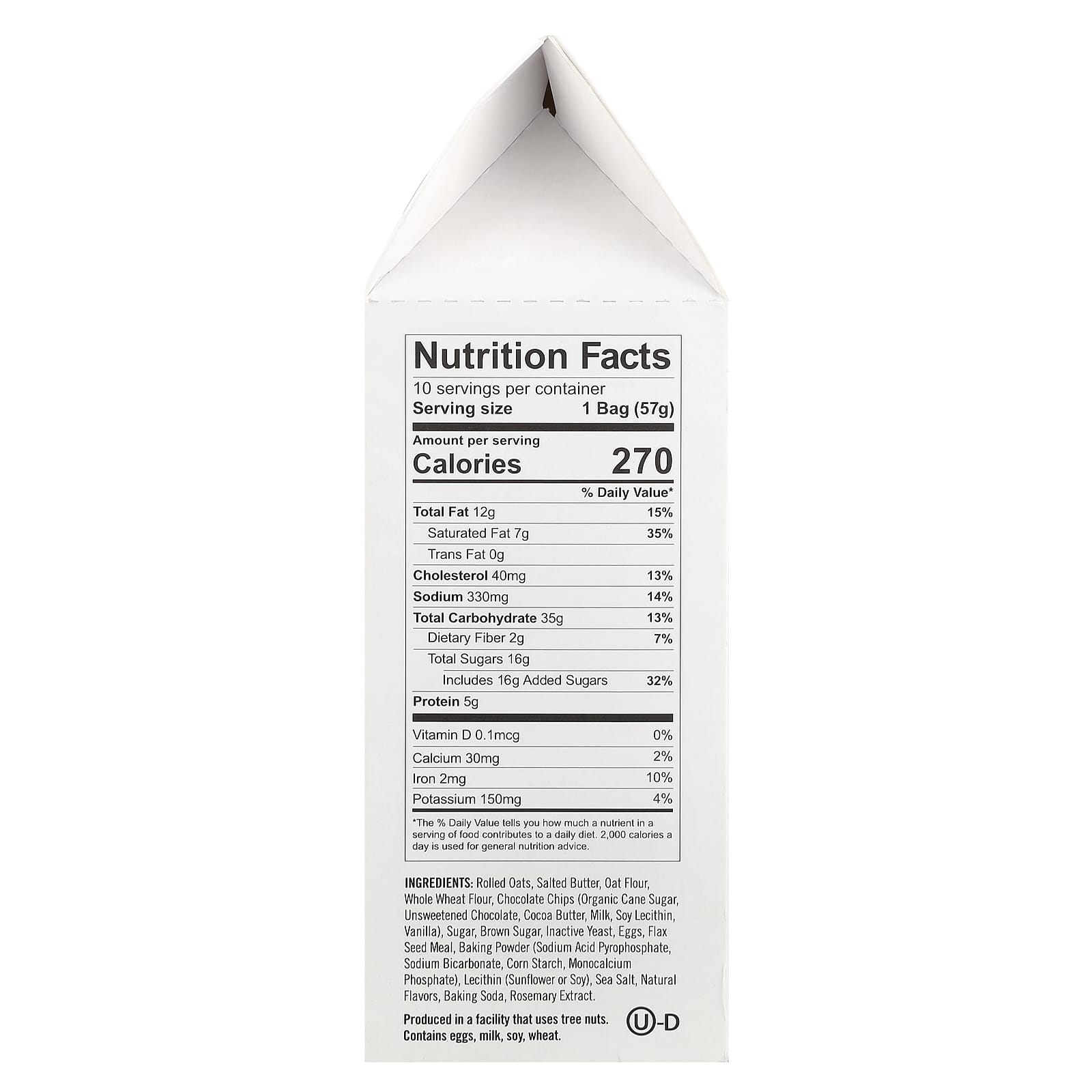 Овсяные хлопья, соленое масло, овсяная мука, цельнозерновая пшеничная мука, шоколадная крошка (органический тростниковый сахар, горький шоколад, какао-масло, молока, соевый лецитин, ваниль), сахара, коричневый сахар, неактивные дрожжи, яйца, льняная мука, разрыхлитель (кислый пирофосфат натрия, бикарбонат натрия, кукурузный крахмал, монокальций фосфат), лецитин (подсолнечный или соевый), морская соль, натуральные ароматизаторы, пищевая сода, экстракт розмарина.