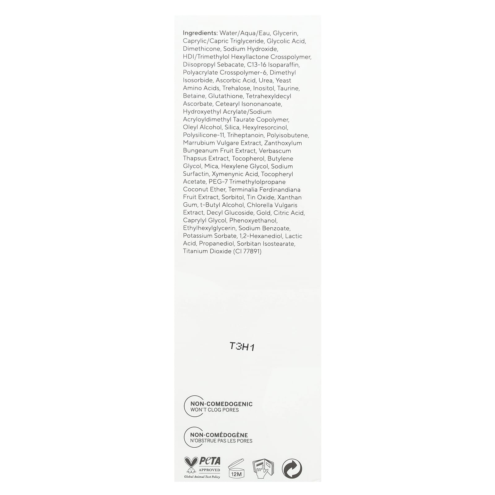 Вода (eau), глицерин, каприловый/каприновый триглицерид, гликолевая кислота, диметикон, гидроксид натрия, HDI/триметилол гексалактон кроссполимер, диизопропил себакат, c13-16 изопарафин, полиакрилата кроссполимер-6, диметил изосорбид, аскорбиновая кислота, мочевина, дрожжевые аминокислоты, трегалоза, инозитол, таурин, бетаин, глутатион, тетрагексилдецил аскорбат, цетиарил изононаноат, гидроксиэтил акрилат/натрия акрилоилдиметилтаурата сополимер, олеиловый спирт, диоксид кремния, гексилрезорцин, полисиликон-11, тригептаноин, полиизобутен, экстракт шандры (Marrubium vulgare), экстракт сычуаньского перца (Zanthoxylum bungeanum), экстракт коровяка (Verbascum thapsus), токоферол, бутиленгликоль, слюда, гексиленгликоль, сурфактин натрия, ксимениновая кислота, токоферилацетат, ПЭГ-7 триметилолпропан и кокосовый эфир, экстракт плодов сливы какаду (Terminalia ferdinandiana), сорбитол, оксид олова, ксантановая камедь, т-бутиловый спирт, экстракт хлореллы (Chlorella vulgaris), децил глюкозид, золото, лимонная кислота, каприлилгликоль, феноксиэтанол, этилгексилглицерин, бензоат натрия, сорбат калия, 1,2-гександиол, молочная кислота, пропандиол, сорбитан изостеарат, диоксид титана (CI 77891).