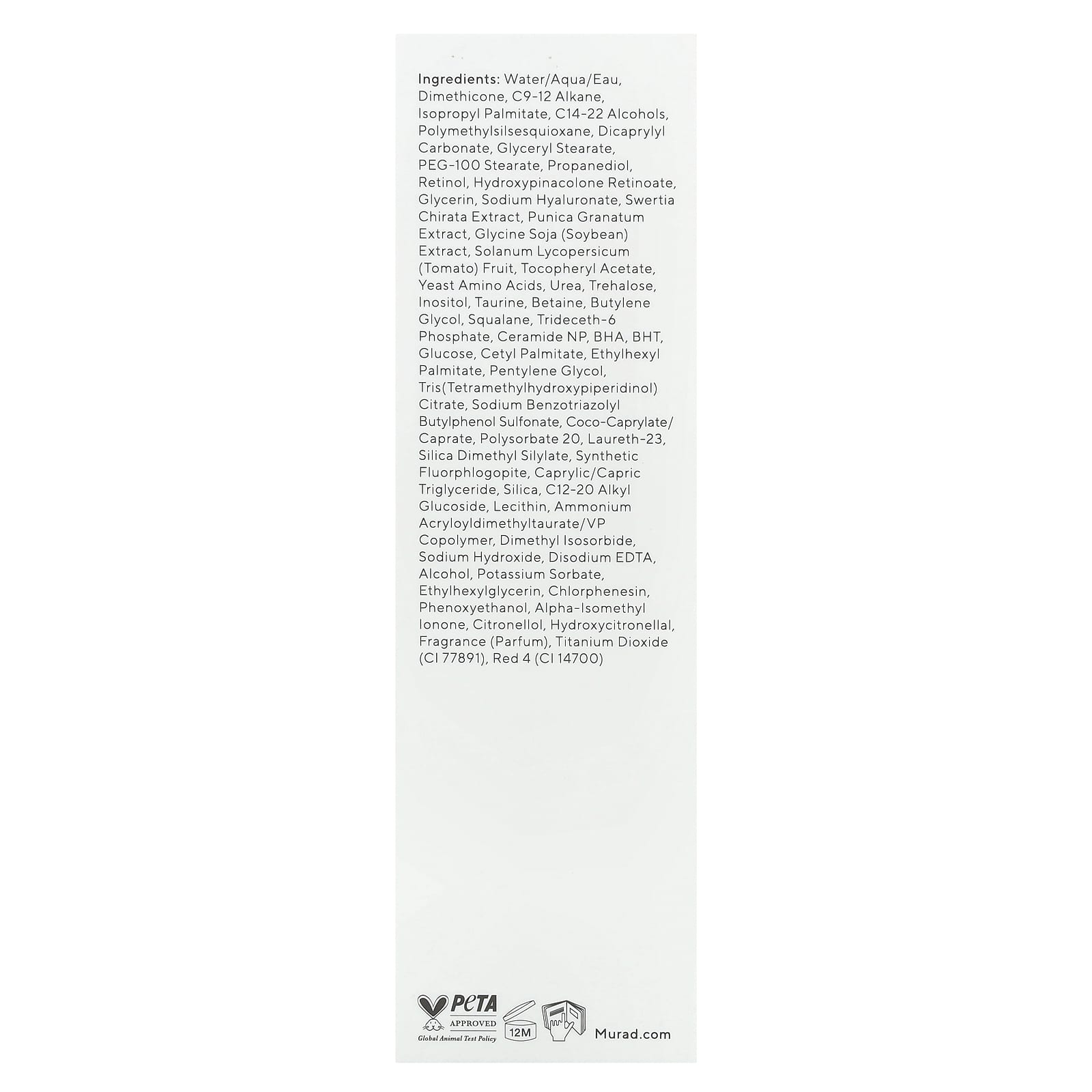 Вода (eau), диметикон, алкан c9-12, изопропилпальмитат, c14-22 спирты, полиметилсилсесквиоксан, дикаприлил карбонат, глицерил стеарат, ПЭГ-100 стеарат, пропандиол, ретинол, гидроксипинаколон ретиноат, глицерин, гиалуронат натрия, экстракт сливы (Swertia chirata), экстракт граната (Punica granatum), экстракт сои (Glycine soja), плоды томата (Solanum lycopersicum), токоферилацетат, дрожжевые аминокислоты, мочевина, трегалоза, инозитол, таурин, бетаин, бутиленгликоль, сквалан, цетет-6 фосфат, керамид NP, бутилоксианизола, бутилгидрокситолуол, глюкоза, цетил пальмитат, этилгексил пальмитат, пентилен гликоль, трис(тетраметилгидроксипиперидинол) цитрат, натрия бензотриазолил бутилфенол сульфонат, коко-каприлат/капрат, полисорбат 20, лаурет-23, диметил силилат диоксида кремния, синтетический фторфлогопит, каприловый/каприновый триглицерид, диоксид кремния, c12-20 алкил глюкозид, лецитин, аммоний акрилоилдиметилтаурат/ВП сополимер, диметил изосорбид, гидроксид натрия, двунатриевая ЭДТК, спирт, сорбат калия, этилгексилглицерин, хлорфенезин, феноксиэтанол, альфа-изометилионон, цитронеллола, гидроксицитронеллаль, отдушка (парфюмерная композиция), диоксид титана (CI 77891), краситель красный 4 (CI 14700).