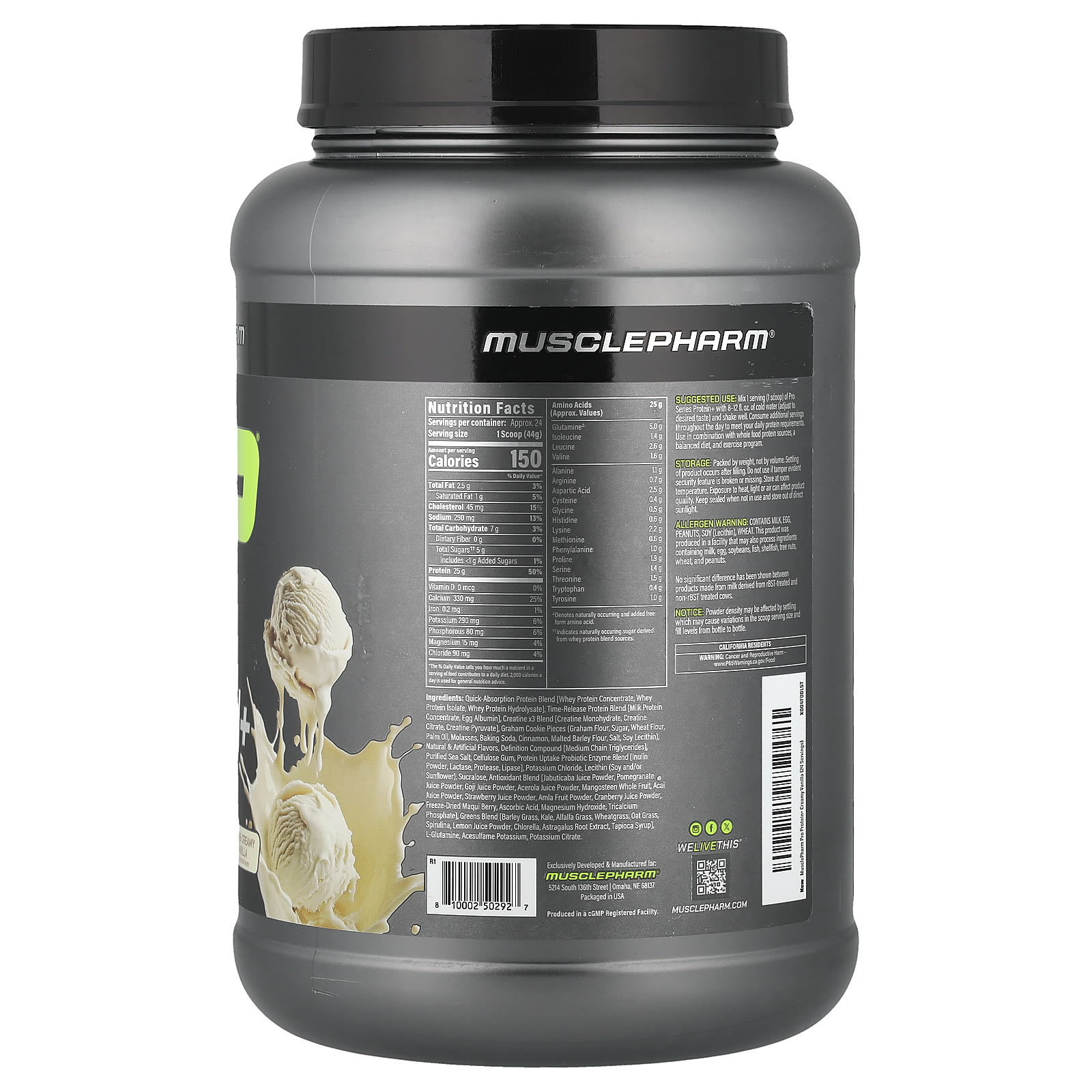 Быстроусвояемая протеиновая смесь [концентрат сывороточного протеина, изолят сывороточного протеина, гидролизат сывороточного протеина], смесь белков с медленным высвобождением [концентрат молочного протеина, яичный альбумин], смесь креатина x3 [моногидрат креатина, креатин цитрат, креатин пируват], кусочки печенья крекеров (мука крекеров, сахар, пшеничная мука, пальмовое масло, патока, пищевая сода, корица, солодовая ячменная мука, соль, соевый лецитин), натуральные и искусственные ароматизаторы, определенное соединение [среднецепочечные триглицериды], очищенная морская соль, целлюлозная камедь, смесь пробиотических ферментов для усвоения белка [инулин в порошке, лактаза, протеаза, липаза], хлорид калия, лецитин (из сои и/или подсолнечника), сукралоза, смесь антиоксидантов [порошок из сока жаботикабы, порошок из гранатового сока, порошок из сока годжи, порошок из сока ацеролы, цельные плоды мангостана, порошок из сока асаи, порошок из клубничного сока, порошок из плодов амлы, порошок из клюквенного сока, сублимированные ягоды аристотелии, аскорбиновая кислота, гидроксид магния, трикальций фосфат], смесь зелени [ростки ячменя, кудрявая капуста, ростки люцерны, порей, овсянка, спирулина, порошок из сока лимона, хлорелла, экстракт корня астрагала, тапиоковый сироп], L-глютамин, ацесульфам калия, цитрат калия.