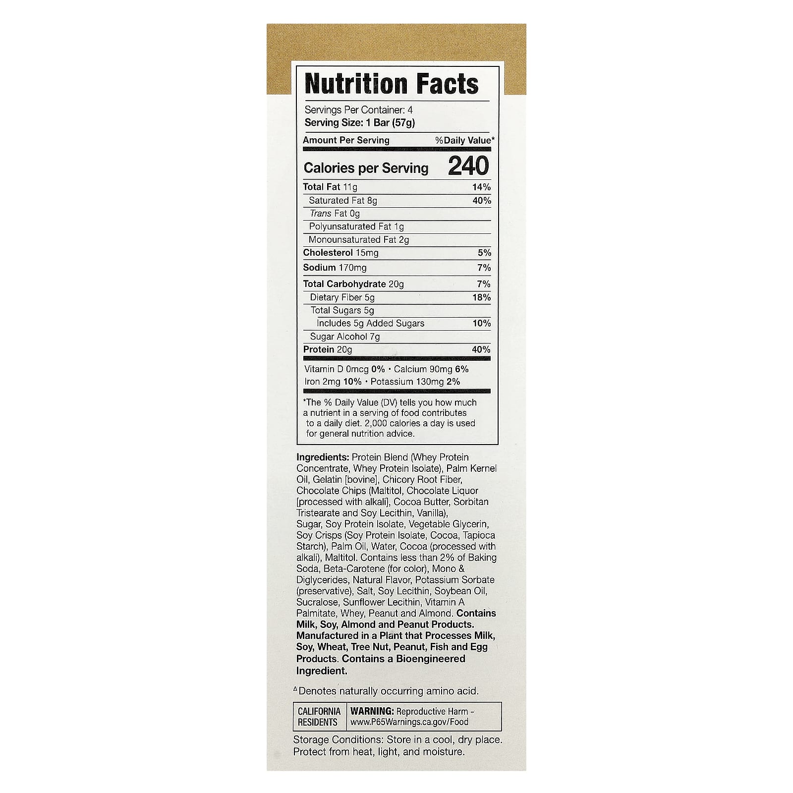 Протеиновая смесь (концентрат сывороточного протеина, изолят сывороточного протеина), пальмоядровое масло, желатин [бычий], клетчатка из корня цикория, шоколадная крошка (мальтит, шоколадный ликер [обработанный щелочью], какао-масло, сорбитан тристеарат и соевый лецитин, ваниль), сахар, изолят соевого белка, растительный глицерин, соевые чипсы (изолят соевого протеина, какао, тапиоковый крахмал), пальмовое масло, вода, какао (обработанное щёлочью), мальтит. содержит менее 2% пищевой соды, бета-каротин (краситель), моно- и диглицериды, натуральный ароматизатор, сорбат калия (консервант), соль, соевый лецитин, соевое масло, сукралоза, подсолнечный лецитин, витамин A (пальмитат), сыворотка, арахис и миндаль.