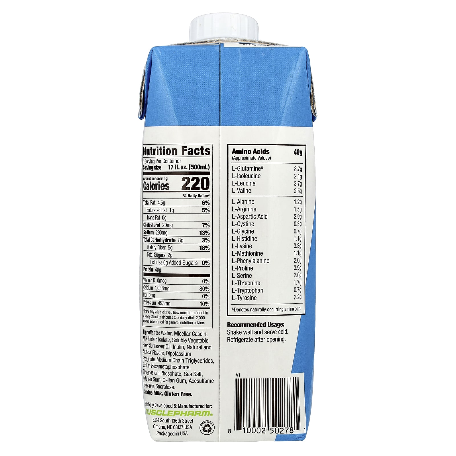 Вода, мицеллярный казеин, изолят молочного протеина, растворимая растительная клетчатка, подсолнечное масло, инулин, натуральные и искусственные ароматизаторы, дикалийфосфат, среднецепочечные триглицериды, гексаметафосфат натрия, димагний фосфат, морская соль, целлюлозная камедь, геллановая камедь, ацесульфам калия, сукралоза.