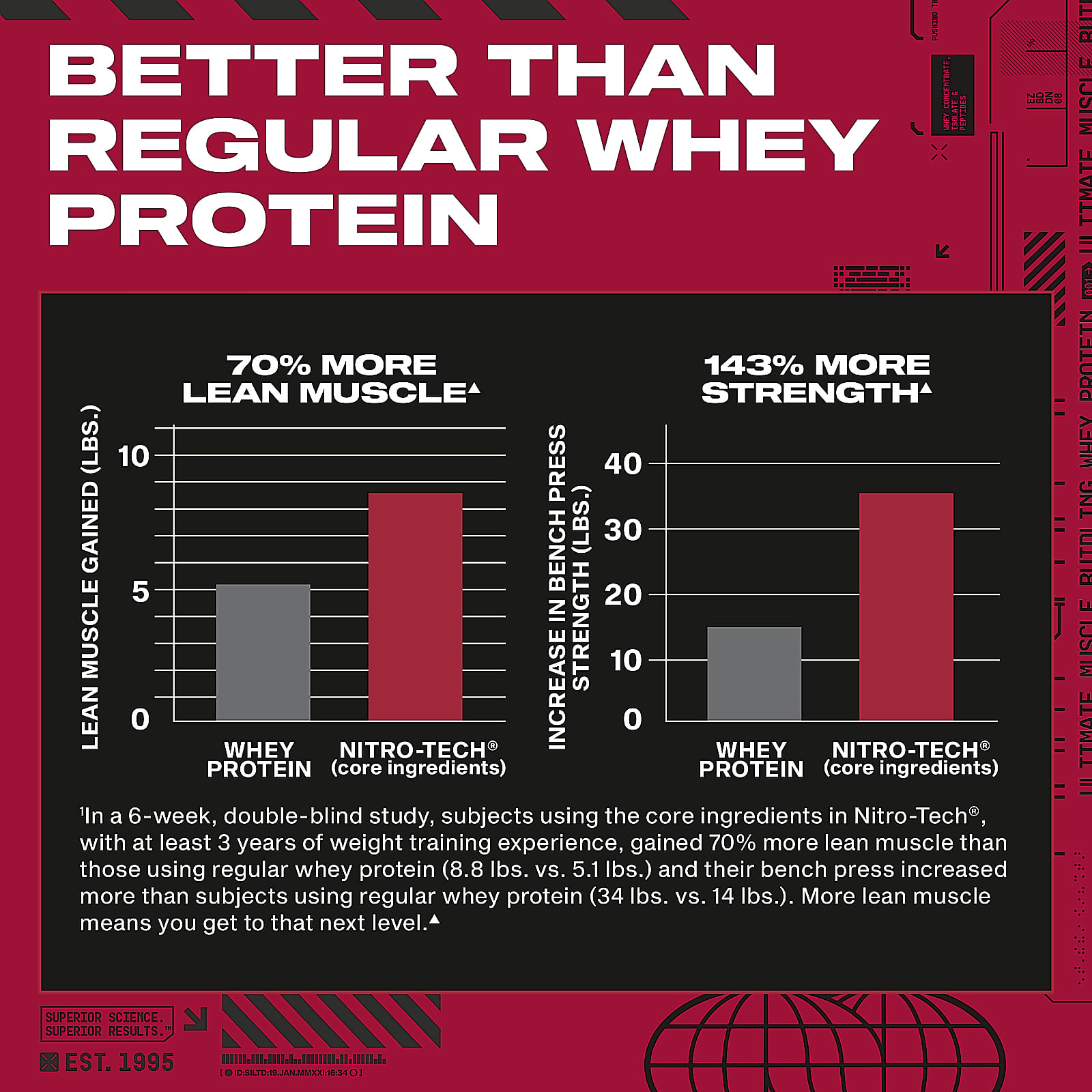 В 6-недельном двойном слепом исследовании участники, принимавшие ключевой ингредиент Nitro-Tech® и имеющие опыт силовых тренировок не менее 3 лет, набрали на 70% больше сухой мышечной массы, чем участники, принимавшие обычный сывороточный протеин (4 кг [8,8 фунта] в сравнении с 2,3 кг (5,1 фунта) а их жим лежа увеличился больше, чем у участников, принимавших обычный сывороточный протеин (34 фунта против 14 фунтов). Наращивание большей сухой мышечной массы означает, что вы переходите на новый уровень.