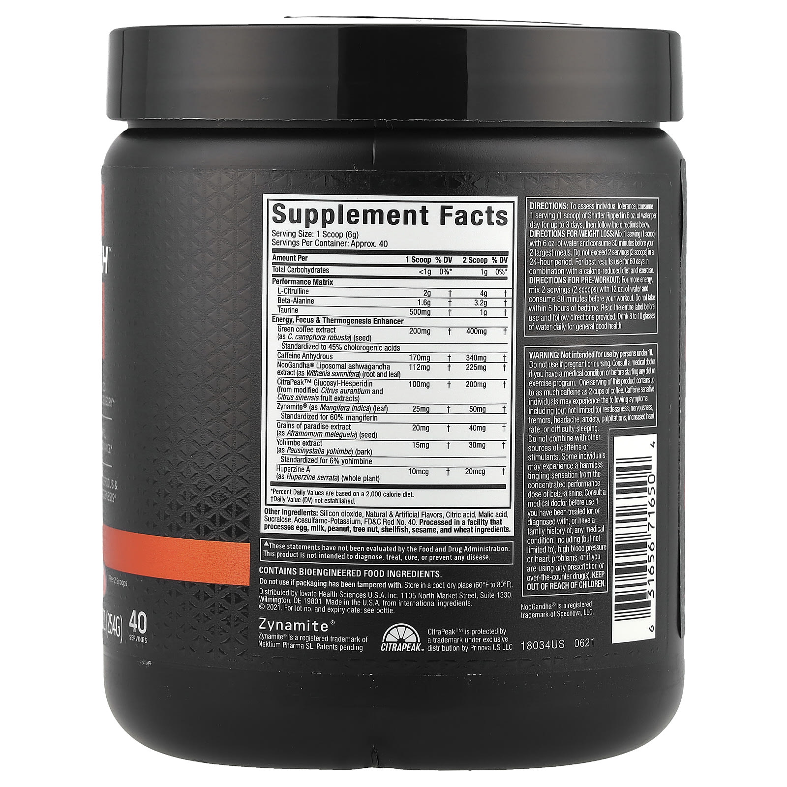 Shatter ™ Ripped для тех, кто отказывается принимать статус-кво. Эта превосходная гибридная формула 2-в-1 разработана с использованием самых популярных предтренировочных ингредиентов, а также экстракта C. canephora robusta - научно протестированного ингредиента для снижения веса, который поможет вам выглядеть и чувствовать себя наилучшим образом. Эта формула содержит точные дозы эффективных ингредиентов, включая зинамит® и L-цитруллин для повышения уровня оксида азота, а также кофеин для экстремальной энергии и повышения концентрации внимания. Он также содержит CitraPeak ™, научно изученную форму глюкозил-гесперидина премиального качества. Shatter Ripped поможет вам побить ваши личные рекорды.