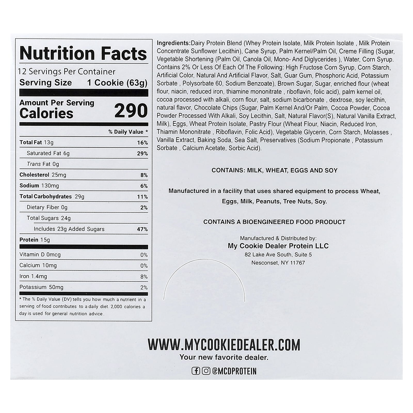 Смесь молочного протеина (изолят сывороточного протеина, изолят молочного протеина , концентрат молочного протеина, подсолнечный лецитин), тростниковый сироп, пальмоядровое/пальмовое масло, кремовая начинка (сахар, растительное масло (пальмовое масло, рапсовое масло, моно- и диглицериды), Вода, кукурузный сироп. содержит не более 2% каждого из следующих ингредиентов: кукурузный сироп с высоким содержанием фруктозы, кукурузный крахмал, искусственных красителей, натуральные и искусственные ароматизаторы, соль, гуаровая камедь, фосфорная кислота, сорбат калия , полисорбат 60, бензоат натрия), коричневый сахар, сахар, обогащенная мука (пшеничная мука, ниацин, восстановленное железо, тиамина мононитрат , рибофлавин, фолиевая кислота), пальмоядровое масло, какао, обработанное щелочью, кукурузная мука, соль, бикарбонат натрия , декстроза, соевый лецитин, натуральный ароматизатор, кусочки шоколада (сахар, пальмового ядра и/или пальмы, какао-порошок, обработанный щелочью какао-порошок, соевый лецитин, соль, натуральный ароматизатор, натуральный экстракт ванили, молоко), Яйца, изолят белка пшеницы, мука для выпечки (пшеничная мука, ниацин, восстановленное железо, мононитрат тиамина , рибофлавин, фолиевая кислота), растительный глицерин, кукурузный крахмал, патока , экстракт ванили, Пищевая сода, морская соль, консерванты (пропионат натрия , сорбат калия , ацетат кальция, сорбиновая кислота).