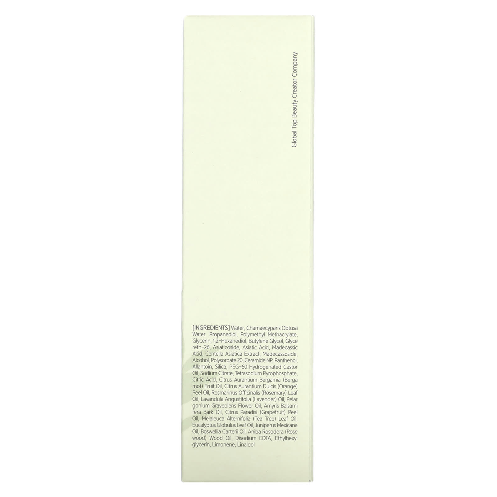 Вода, вода из кипарисовика туполистного (Chamaecyparis obtusa), пропандиол, полиметилметакрилат, глицерин, 1,2-гександиол, бутиленгликоль, глицерет-26, азиатикозид, азиатиковая кислота, мадекассовая кислота, экстракт готу колы (Centella asiatica), мадекассосид, спирт, полисорбат 20, керамид NP, пантенол, аллантоин, диоксид кремния, ПЭГ-60 гидрогенизированное касторовое масло, цитрат натрия, тетранатрия пирофосфат, лимонная кислота, масло бергамота (Citrus aurantium bergamia), масло из цедры апельсина (Citrus aurantium dulcis), масло из листьев розмарина (Rosmarinus officinalis), лавандовое масло (Lavandula angustifolia), масло из цветков герани (Pelargonium graveolens), масло из коры амириса (Amyris balsamifera), масло из цедры грейпфрута (Citrus paradisi), масло из листьев чайного дерева (Melaleuca alternifolia), масло из листьев эвкалипта шаровидного (Eucalyptus globulus), масло можжевельника мексиканского (Juniperus mexicana), масло босвеллии (Boswellia carterii), масло из дерева розодора (Aniba rosodora), двунатриевая ЭДТК, этилгексилглицерин, лимонен, линалоол.