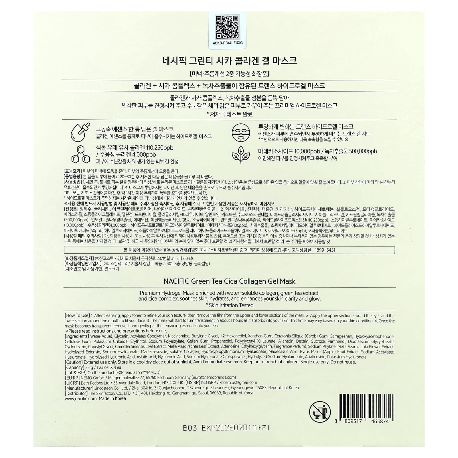 Гидрогелевая маска премиального качества, обогащенная водорастворимым коллагеном, экстрактом зеленого чая и комплексом цики, успокаивает кожу, увлажняет ее, повышает чистоту и сияние.