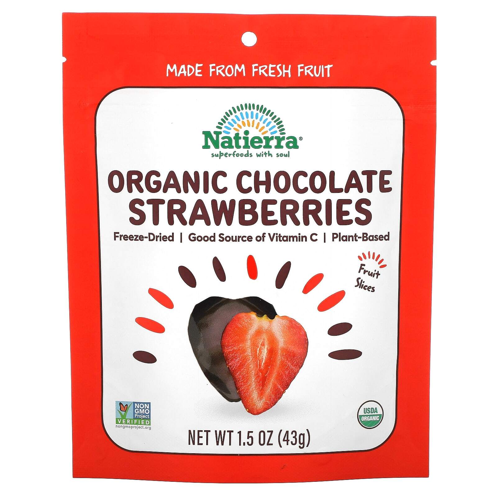 Органическая клубника, органический темный шоколад (органический сахар, органическая какао-масса, органическое какао-масло и органический лецитин из сои).