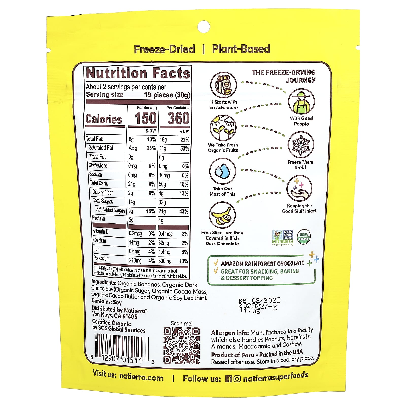 Этот превосходный снек изготовлен из темного шоколада, содержащего 55% какао (полученного экологичным способом из тропических лесов Амазонки) и органических фруктов. Плоды сублимируют, удаляя большую часть воды и добавляя непреодолимую хрустящую консистенцию.