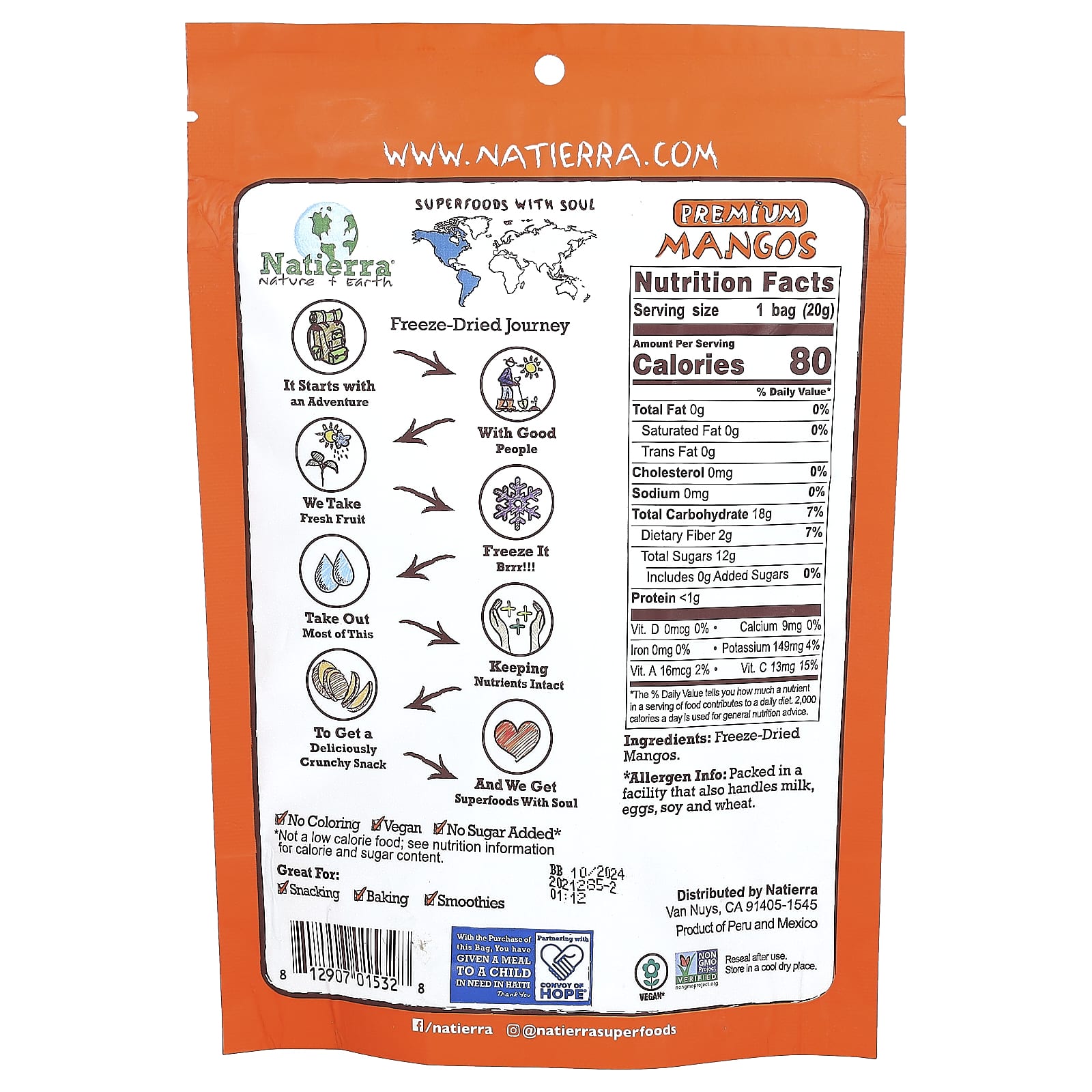 Этот полезный снек начинается со свежего манго, полученного из сезонных культур. Нарезанное манго подвергают сублимационной сушке, в результате которой удаляется большая часть воды и добавляется хруст, который делает манго абсолютно аппетитным.