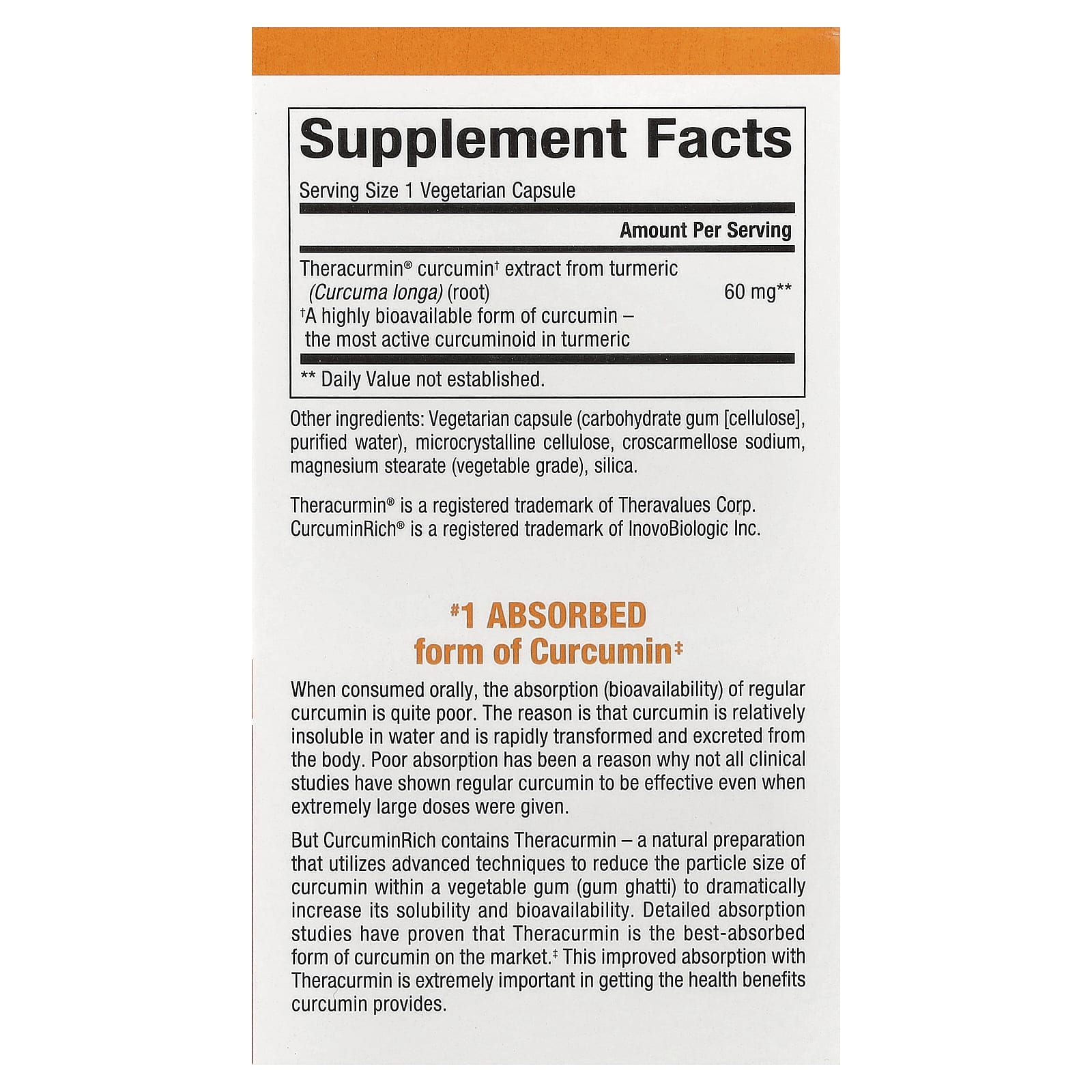 При пероральном приёме всасывание (биодоступность) обычного куркумина довольно низкое. Причина в том, что куркумин относительно нерастворим в воде, быстро трансформируется и выводится из организма. Плохое всасывание было причиной того, что не все клинические исследования показали эффективность куркумина, даже при приеме чрезвычайно высоких доз. При производстве натурального препарата Theracurmin, который содержится в составе CurcuminRich, используются передовые методы уменьшения размера частиц куркумина в растительной камеди (камедь гхатти), что значительно увеличивает его растворимость и биодоступность. Подробные исследования усвояемости доказали, что Theracurmin является самой лучшей по усвояемости формой куркумина на рынке‡. Улучшенная усвояемость за счет Theracurmin чрезвычайно важна для получения организмом всех полезных свойств куркумина.