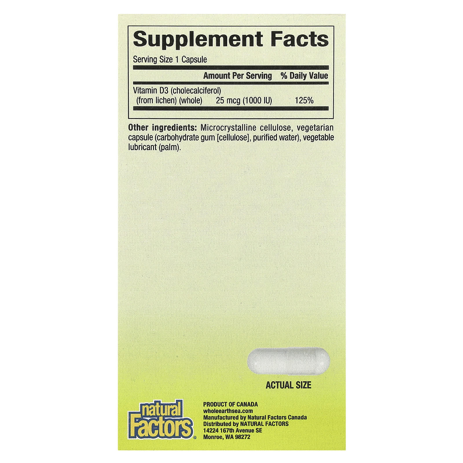 | Витамин D3 (холекальциферол) (из лишайника) (цельный) | 25 мкг (1000 МЕ) | 125% |