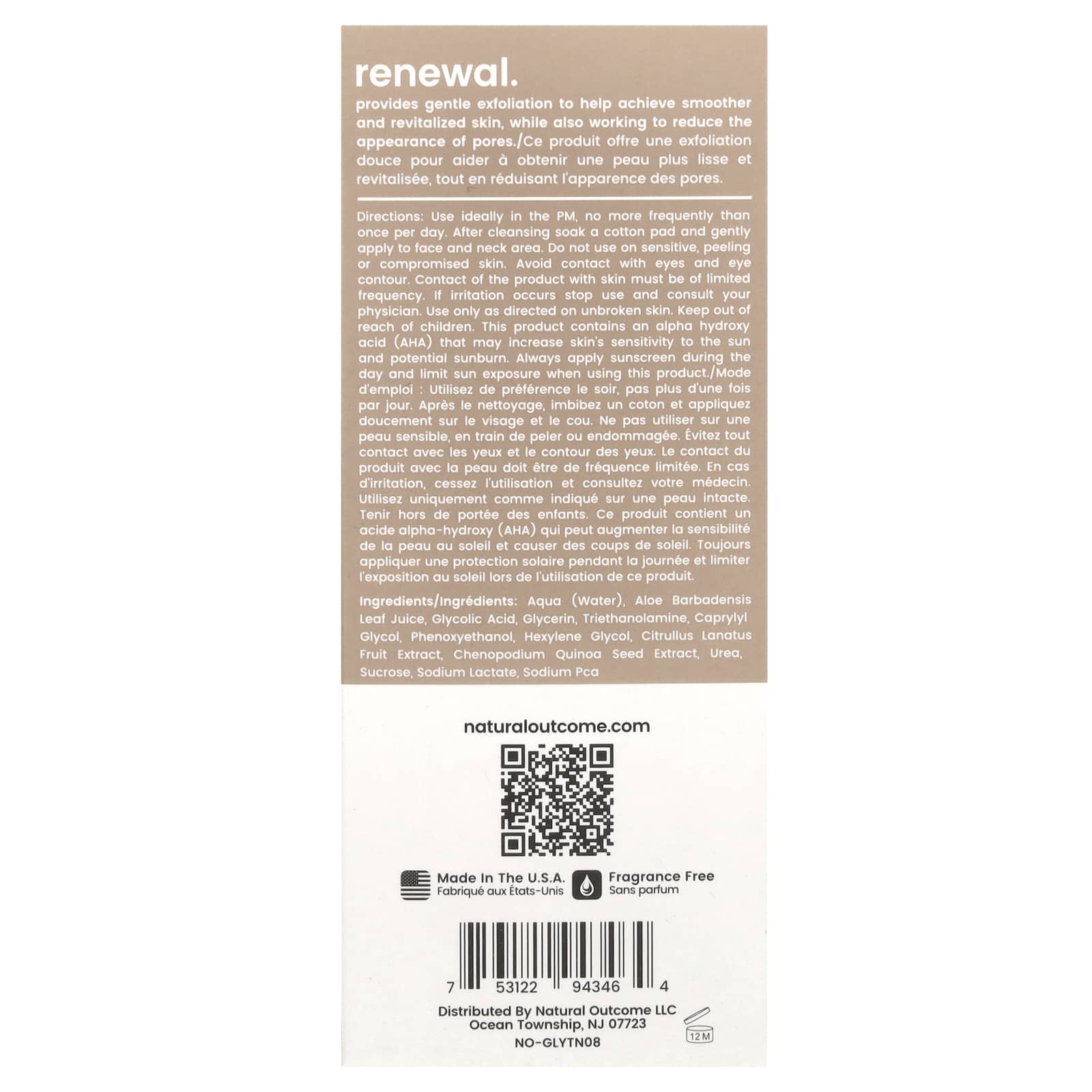 При появлении раздражения прекратите использование и обратитесь к врачу. Используйте только согласно инструкции на здоровой коже. Хранить в недоступном для детей месте. Этот продукт содержит альфа-гидроксикислоту (АГК), которая может повысить чувствительность кожи к солнцу и потенциальным солнечным ожогам. Всегда наносите солнцезащитный крем в течение дня и ограничивайте пребывание на солнце при использовании этого продукта.