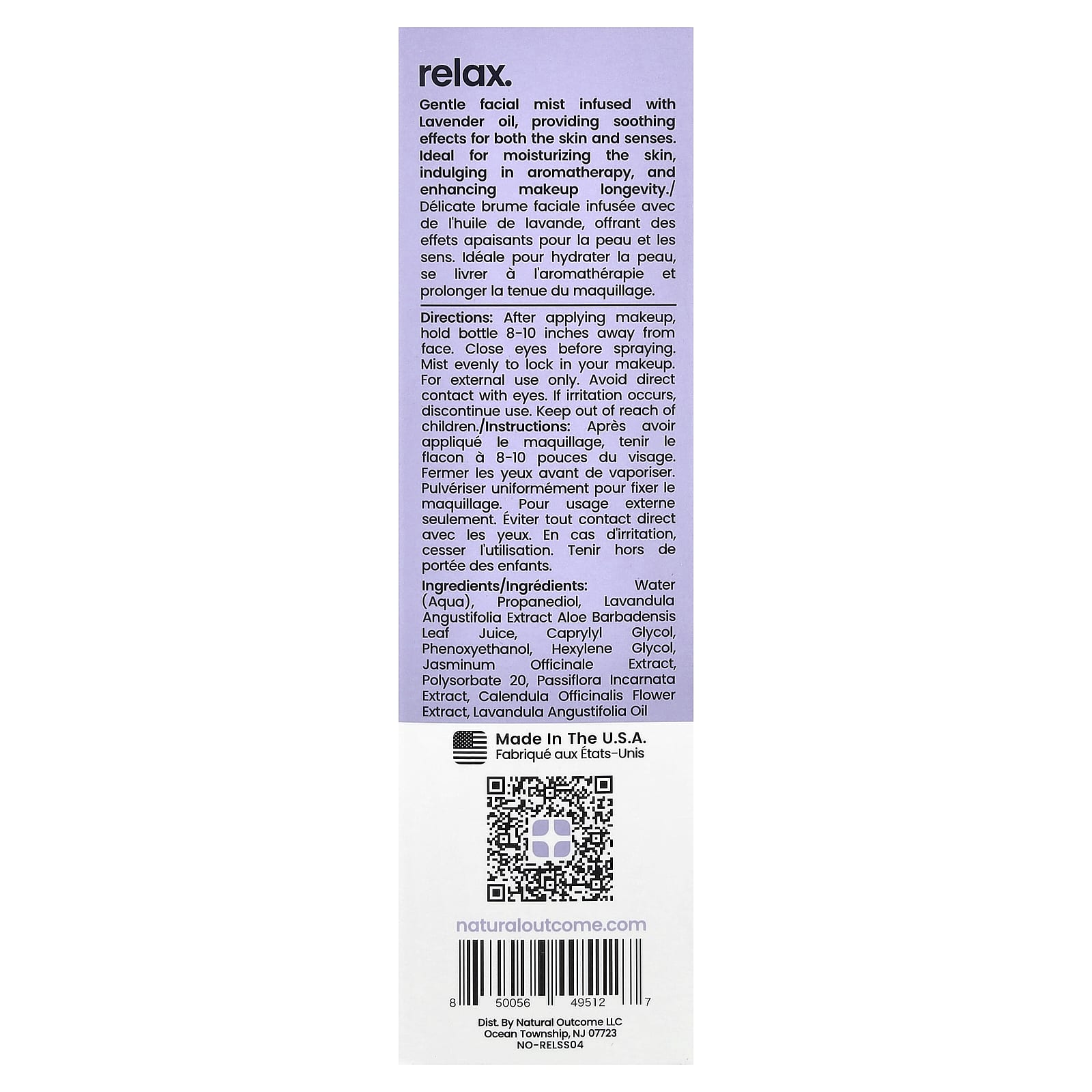 Вода (Aqua), пропандиол, экстракт лаванды (Lavandula angustifolia) сок листьев алоэ вера (Aloe barbadensis), каприлилгликоль, феноксиэтанол, гексиленгликоль, экстракт жасмина (Jasminum officinale), полисорбат 20, экстракт пассифлоры (Passiflora incarnata), экстракт цветков календулы (Calendula officinalis), масло лаванды (Lavandula angustifolia).