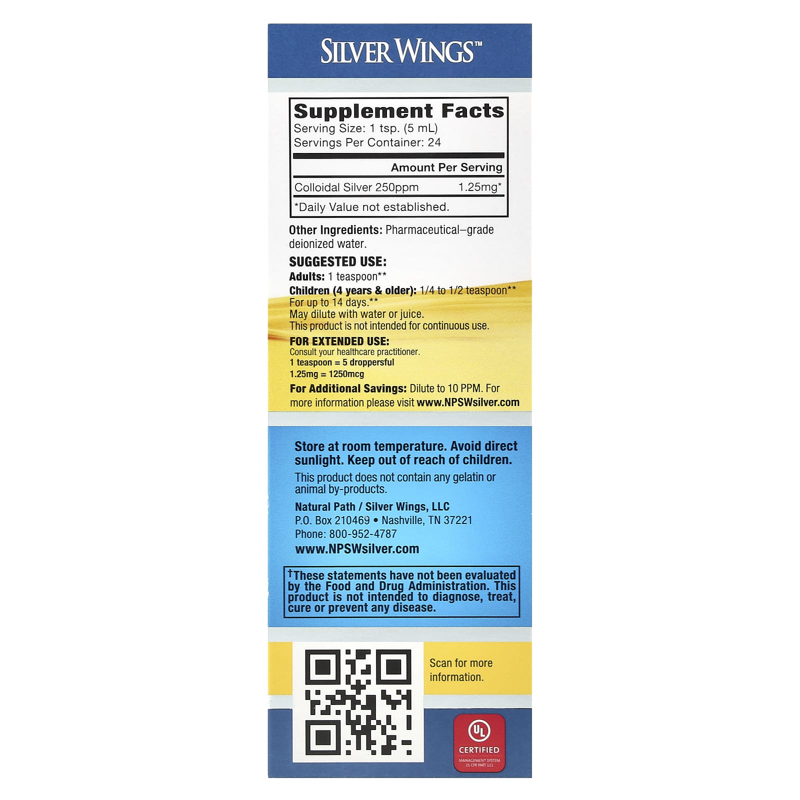 Части на миллион (PPM) равняются количеству частиц серебра в одной порции. 50, 150, 250 & 500 част. / Млн - это уровни прочности. Рекомендуемая суточная дозировка составляет 10 част. / Млн. 1 чайная ложка Silver Wings (250 част. / Млн) равна 4 жидк. унции (10 част. / млн).